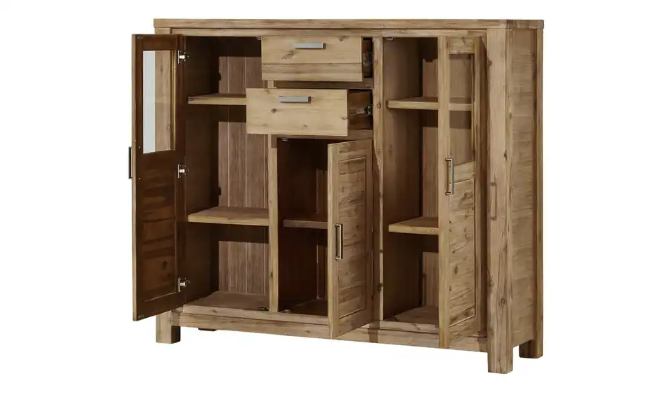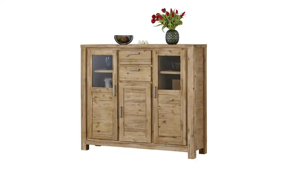 Dieses Highboard vereint die Vorteile von Kommode und Vitrine gekonnt. Die Kombination aus blickdichten Fronten aus massivem Akazienholz und Glas überzeugt. So findet das Highboard in diversen Einrichtungsstilen seinen Platz.Lieferung & Versand