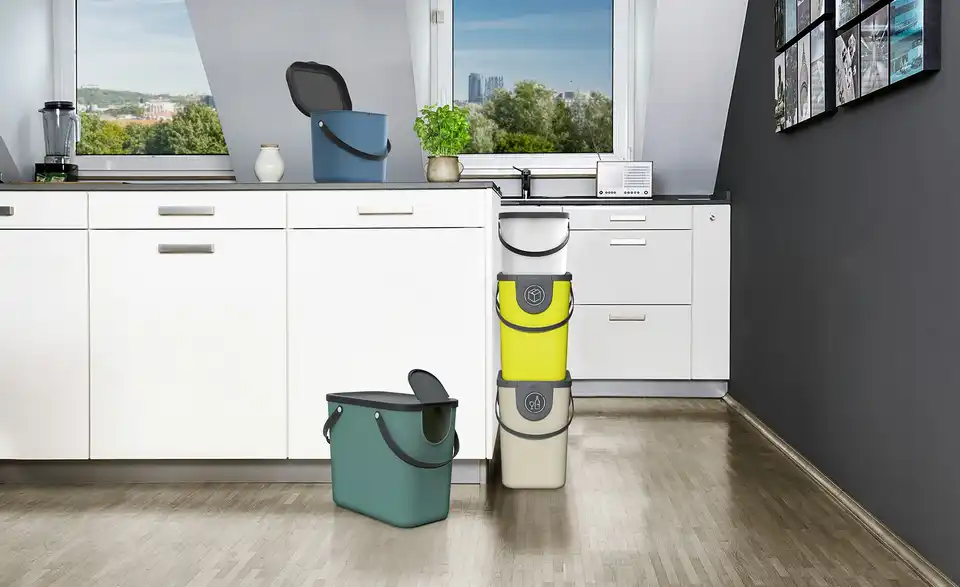 Das Müllsystem mit Deckel bietet Ihnen die Möglichkeit, den Abfall im Haushalt ganz einfach zu trennen. Die verschiedenen Eimer aus Kunststoff lassen sich problemlos aufeinander stapeln, sodass sie auch in Räumen mit wenig Platz perfekt eingesetzt werden können. Und bei Nichtbenutzung stapeln Sie die verschiedenen Eimer einfach ineinander. Durch die Griffe können Sie die Abfalleimer auch bequem transportieren. Beim Recycling Müllsystem ALBULA lässt sich auf einen Blick erkennen, welche Abfallprodukte in welchen Eimer gehören. Dafür wird an der Vorderseite des Deckels ein Aufkleber angebracht, der anzeigt, ob PET-Flaschen, Glasflaschen oder Papier in den Abfalleimer gehören.Lieferung & Versand