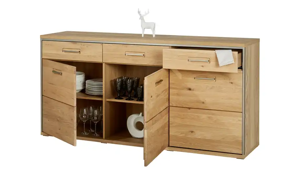 - Mehr zu MaterialFront aus Massivholz in Asteiche Bianco geöltKorpus aus Holzwerkstoff furniert in Eiche Bianco geölt / Abestzung aus Metall in Edelstahloptik