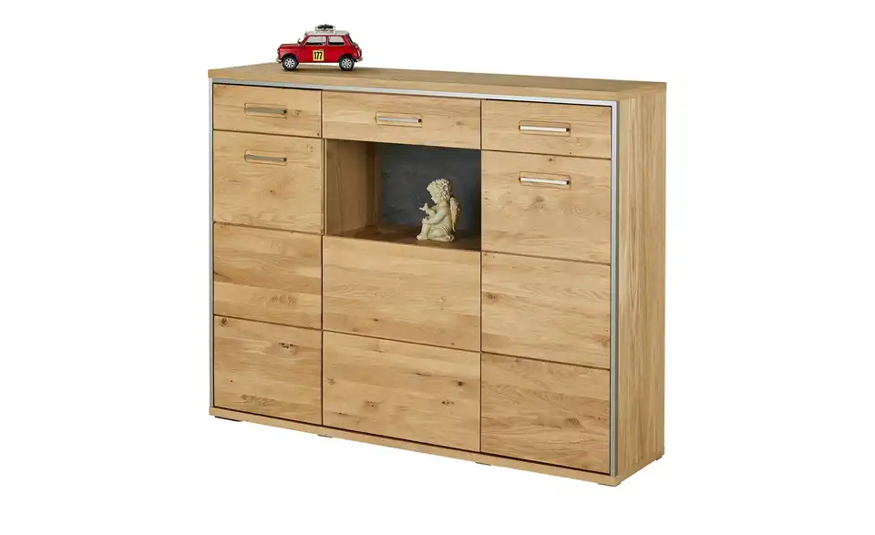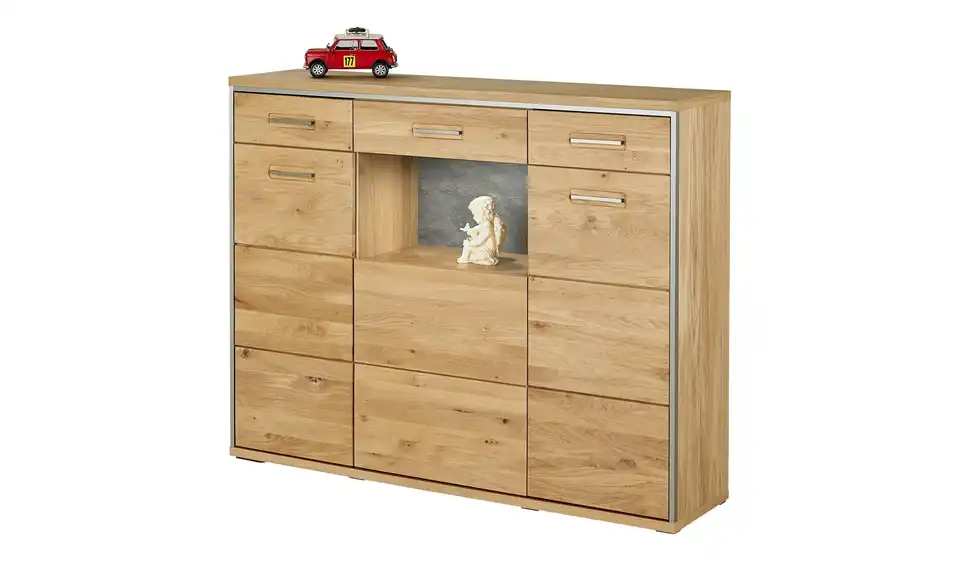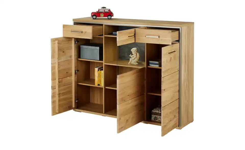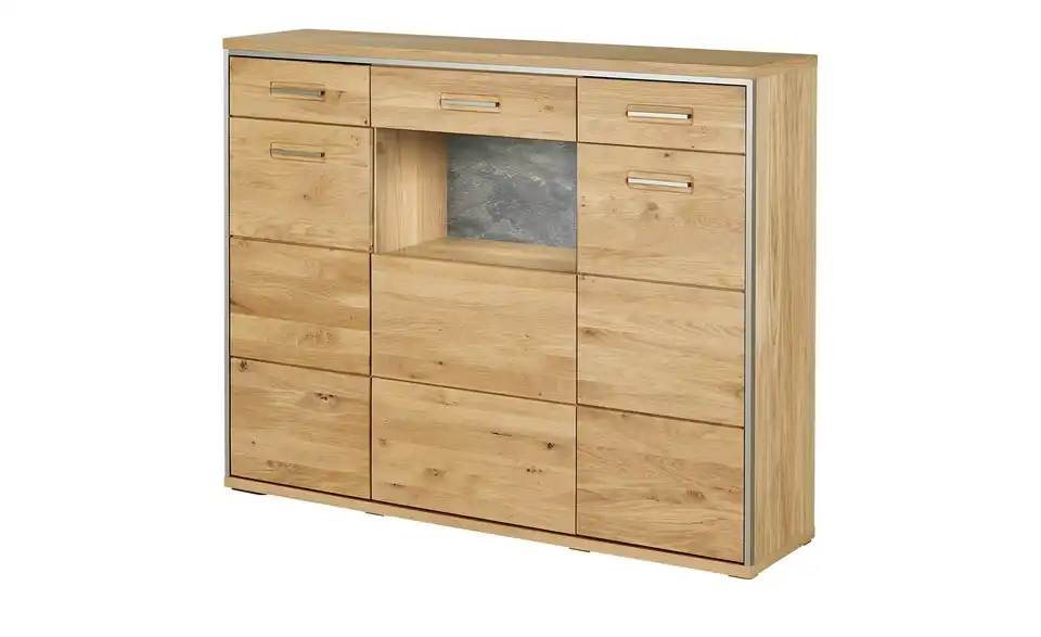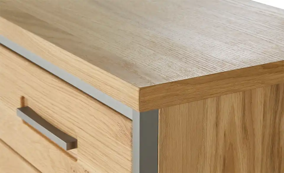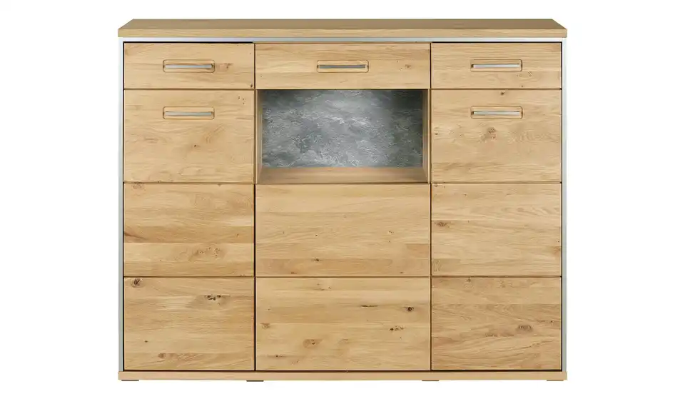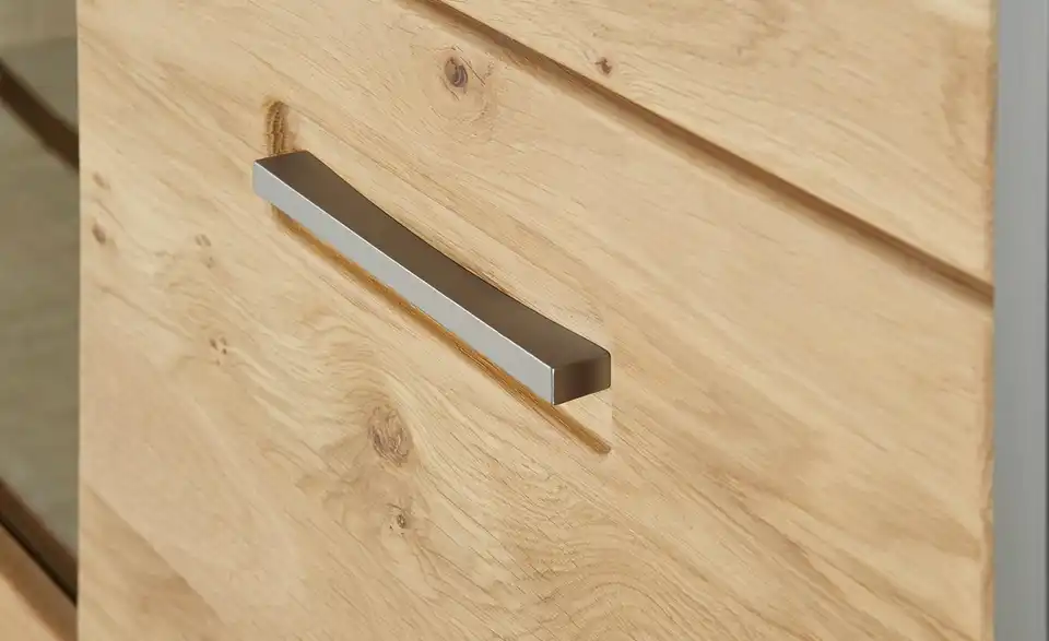 - Mehr zu MaterialFront aus Massivholz in Asteiche Bianco geöltKorpus aus Holzwerkstoff furniert in Eiche Bianco geölt / Abestzung aus Metall in EdelstahloptikSichtbare Rückwand aus Holzwerkstoff foliert in Schiefer (Nachbildung)Frontverglasung aus Klarglas