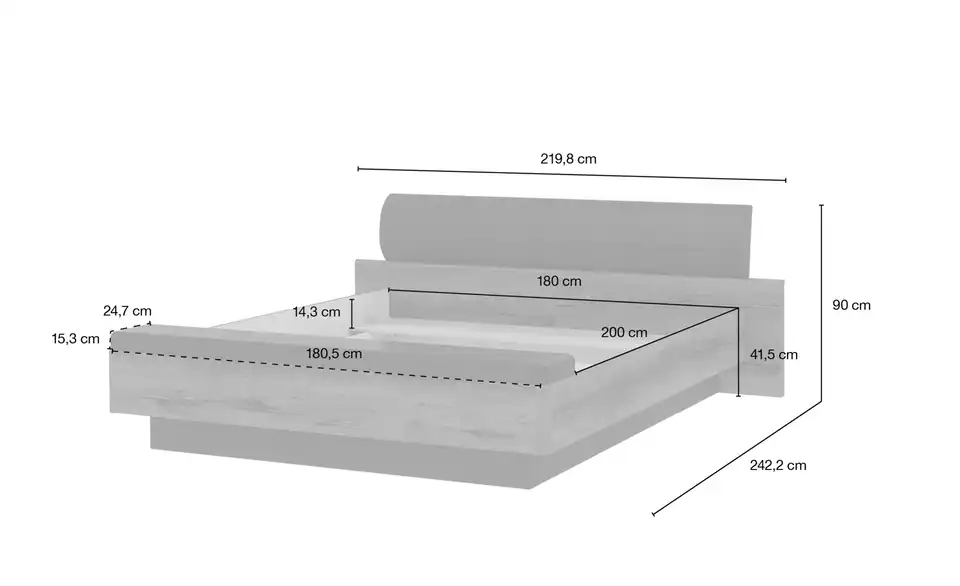 - Mehr zu MaßenInnenmaße der Fußbank (BHT 180,5 cm x 15,3 cm x 24,7 cm)Einlegetiefe Lattenrost max. 14,3 cmLattenrahmen-Einlegetiefe ca. 14,3 cm