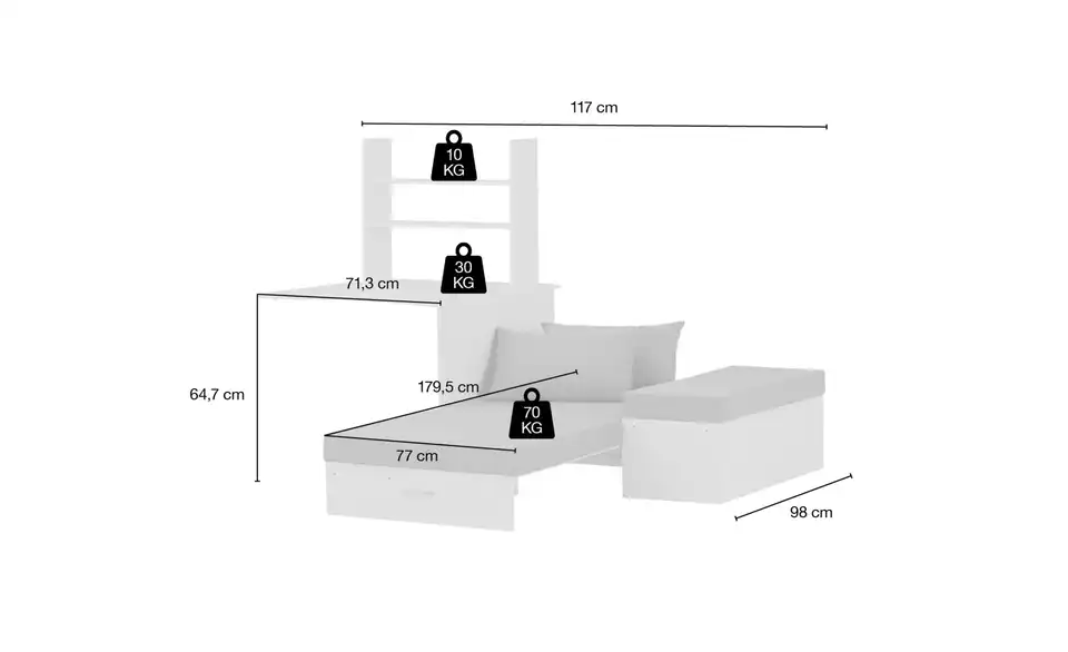 - Sicherheitshinweisemax. Belastbarkeit 70kgmax. Belastbarkeit Hängeschreibtisch 30 kgmax. Belastbarkeit Regalböden 10kg