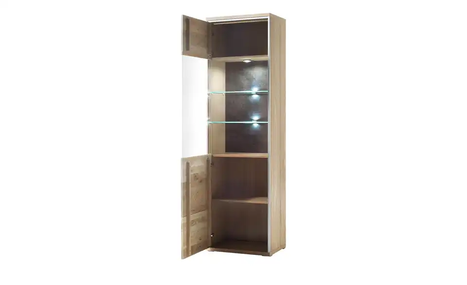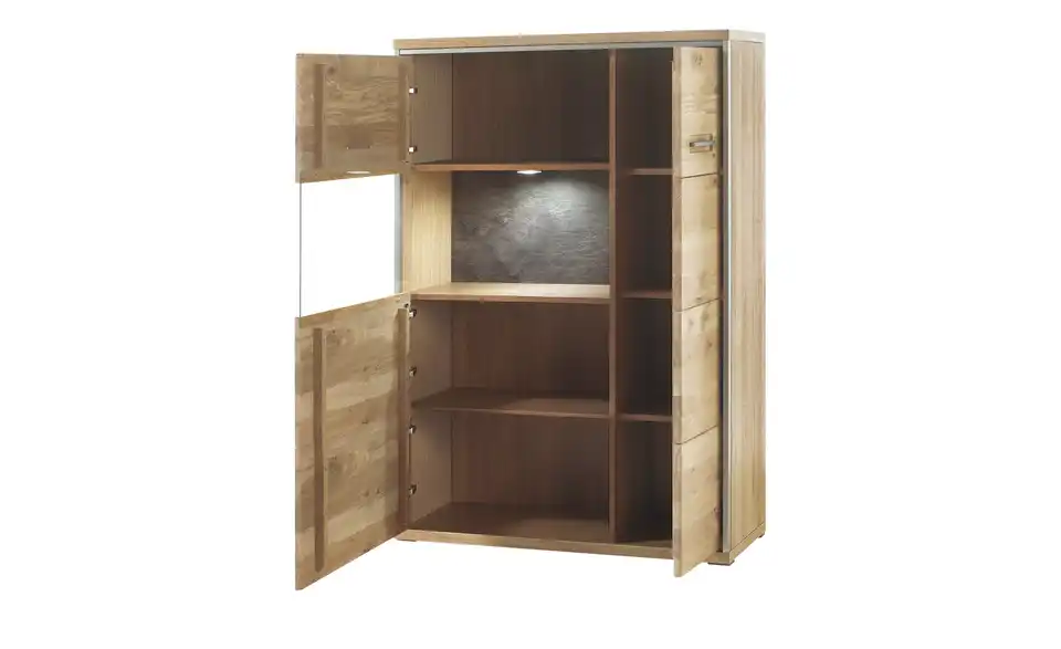 - Mehr zu MaterialFront aus Massivholz in Asteiche Bianco geöltKorpus aus Holzwerkstoff furniert in Eiche Bianco geölt / Abestzung aus Metall in EdelstahloptikSichtbare Rückwand aus Holzwerkstoff foliert in Schiefer (Nachbildung)Frontverglasung aus Klarglas