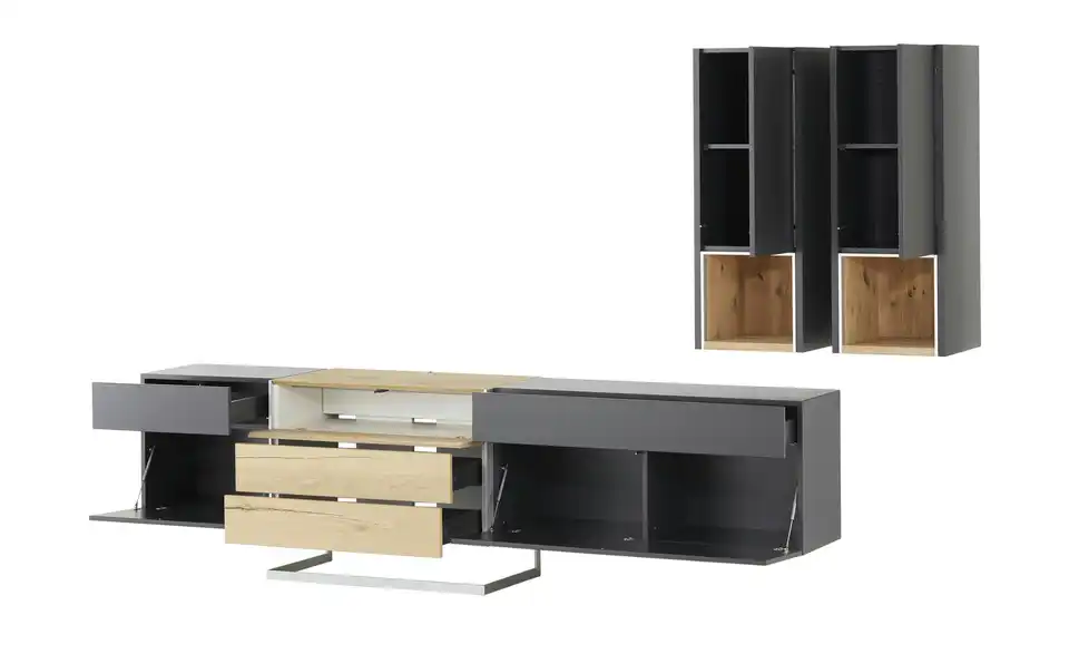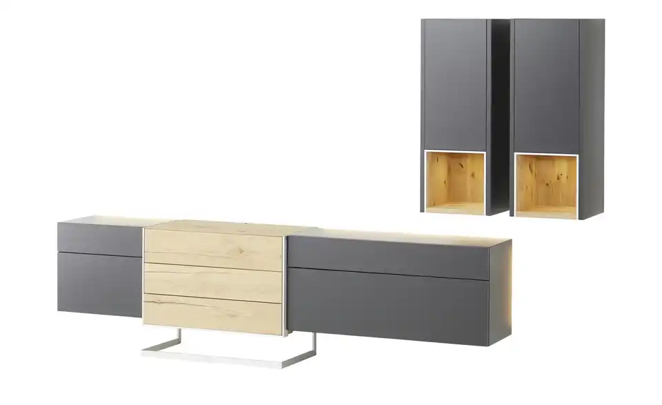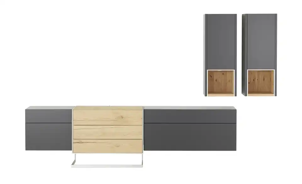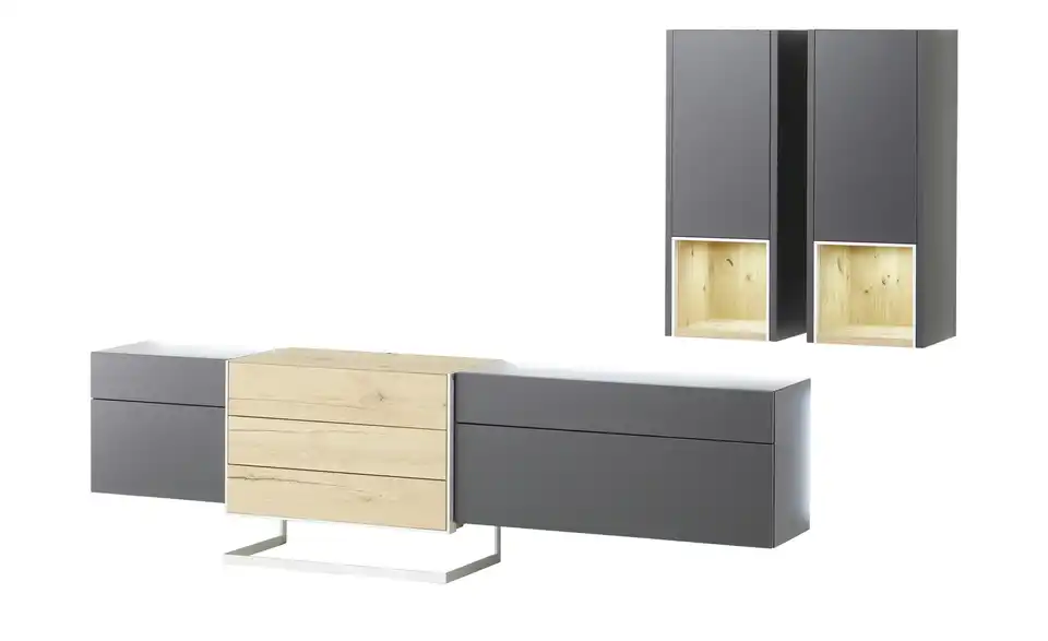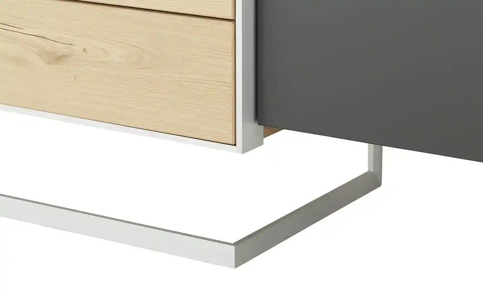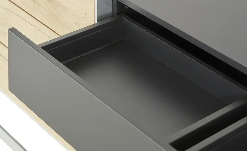 - Mehr zu MaterialKorpus und Front aus Holzwerkstoff in Schiefer Schwarz matt lackiertAbsetzung aus Holzwerkstoff furniert in Wildeiche hell