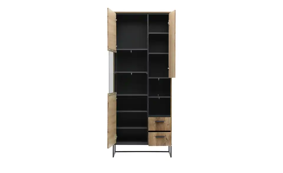 - Mehr zu MaterialKorpus und Front aus Holzwerkstoff foliert in Haveleiche Cognac (Nachbildung) / innen Graphit (Grau)Griffe aus Aluminium in Anthrazit beschichtetFrontverglasung aus Klarglas