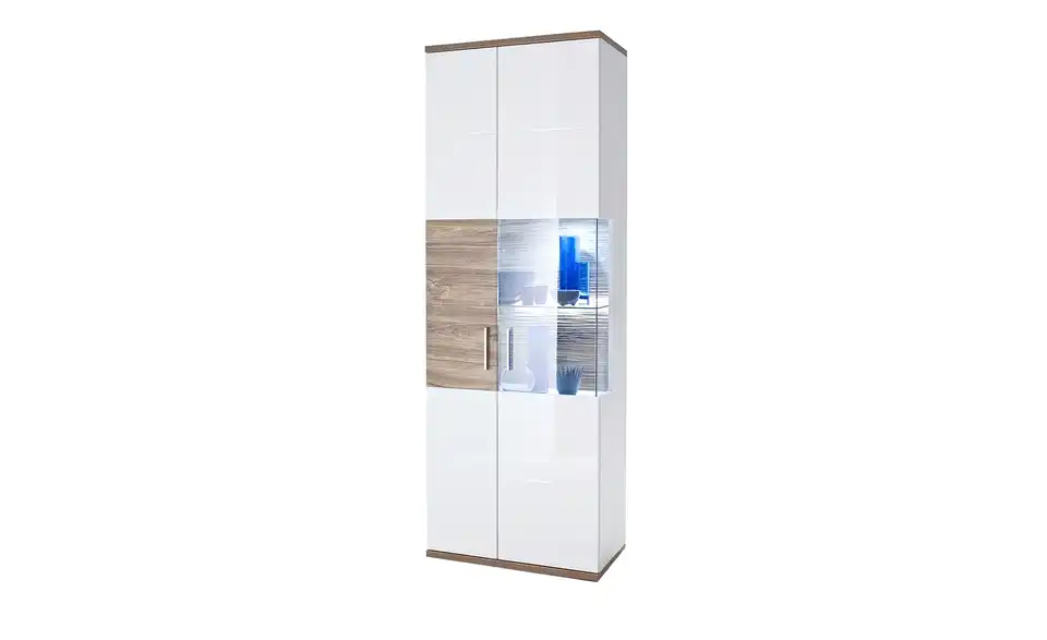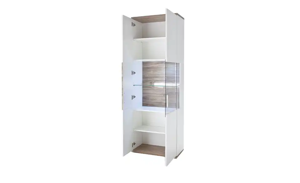 - Mehr zu MaterialFront aus MDF (Mitteldichte Faserplatte) in Weiß hochglanz tiefzieh (Nachbildung) / Absetzung aus MDF in Sterling Oak tiefzieh (Nachbildung)Korpus aus DBS (Direktbeschichtete Spanplatte) in Weiß matt Melamin (Nachbildung) / Absetzung aus DBS in Sterling Oak (Nachbildung)Front- und Seitenverglasung aus ESG (Einscheibensicherheitsglas) in Parsol Grausichtbare Rückwand aus Kunststoff in 3D-Optik Sterling Oak tiefzieh (Nachbildung)