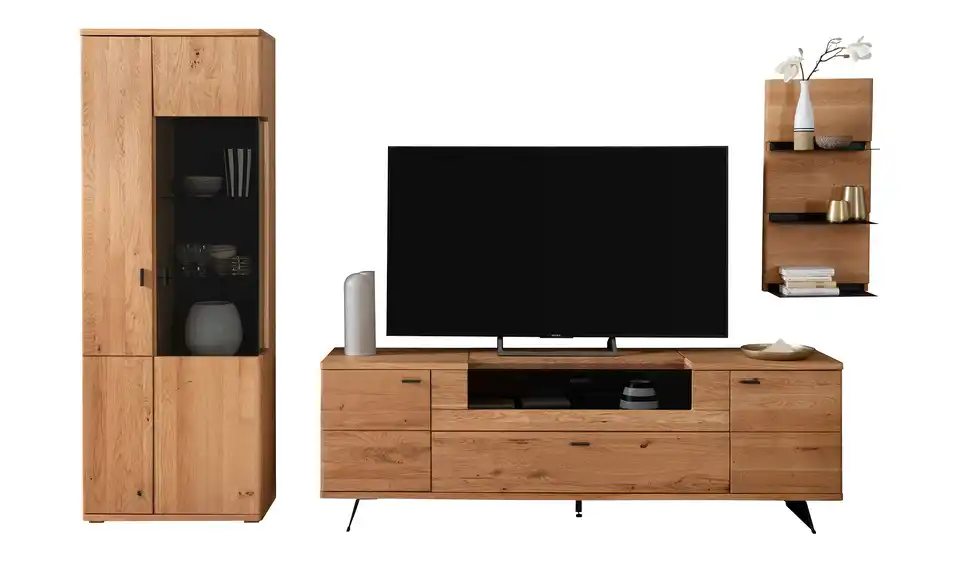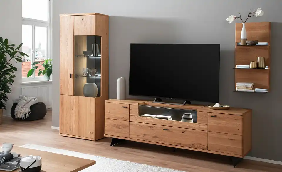 - Mehr zu MaterialFront aus Massivholz in Wildeiche geöltKorpus aus Holzwerkstoff furniert in Wildeiche geölt / innen Holzwerkstoff beschichtet in Wildeiche (Nachbildung)Sichtbare Rückwand und Rückwand hinter Türen und Schubkasten aus Holzwerkstoff beschichtet in DunkelgrauFront- und Korpusverglasung aus ESG (Einscheibensicherheitsglas) in Parsol Grau / Glasböden aus Klarglas