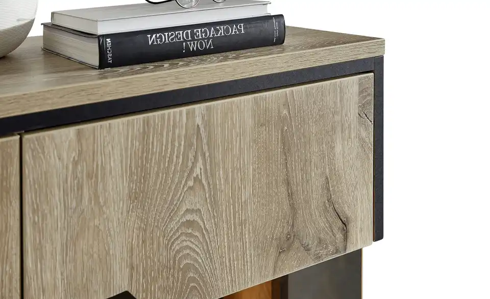 - Mehr zu MaterialKorpus und Front aus Holzwerkstoff foliert in Viking Oak Nature (Eiche Nachbildung) / Absetzung in Schwarz mattsichtbare Rückwand aus Holzwerkstoff foliert in Hirnholz Moasik Optik (Nachbildung)Front- und Seitenverglasung in Parsol Grau
