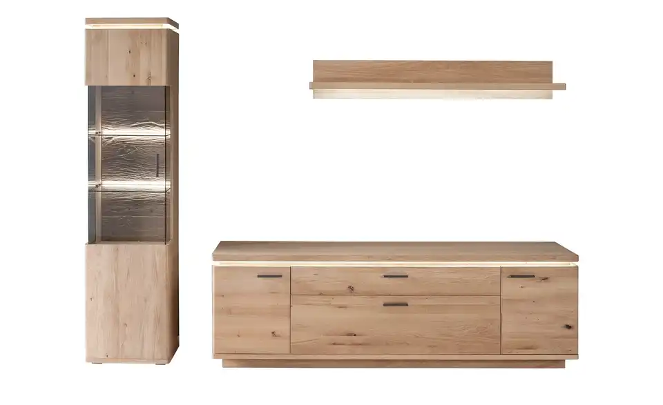 - Mehr zu MaterialFront aus Massivholz in Balkeneiche Bianco geöltKorpus aus Holzwerkstoff furniert in Eiche Bianco geölt / innen Eiche Bianco (Nachbildung)Front- und Seitenverglasung aus ESG (Einscheibensicherheitsglas) in Parsol (Grau) / Glasböden in Klarglassichtbare Rückwand in 3D Balkeneiche (Nachbildung) geschroppt