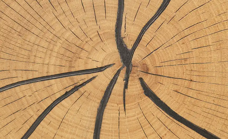 - AusführungApplikationen aus massivem Hirnholz mit Schwarz verfüllten Rissen