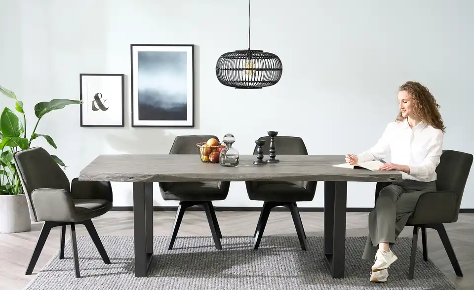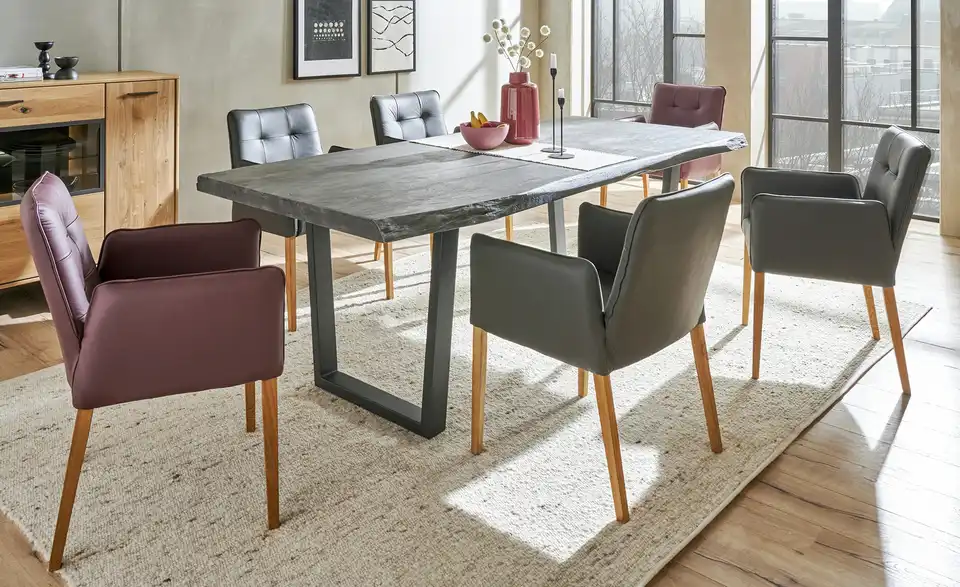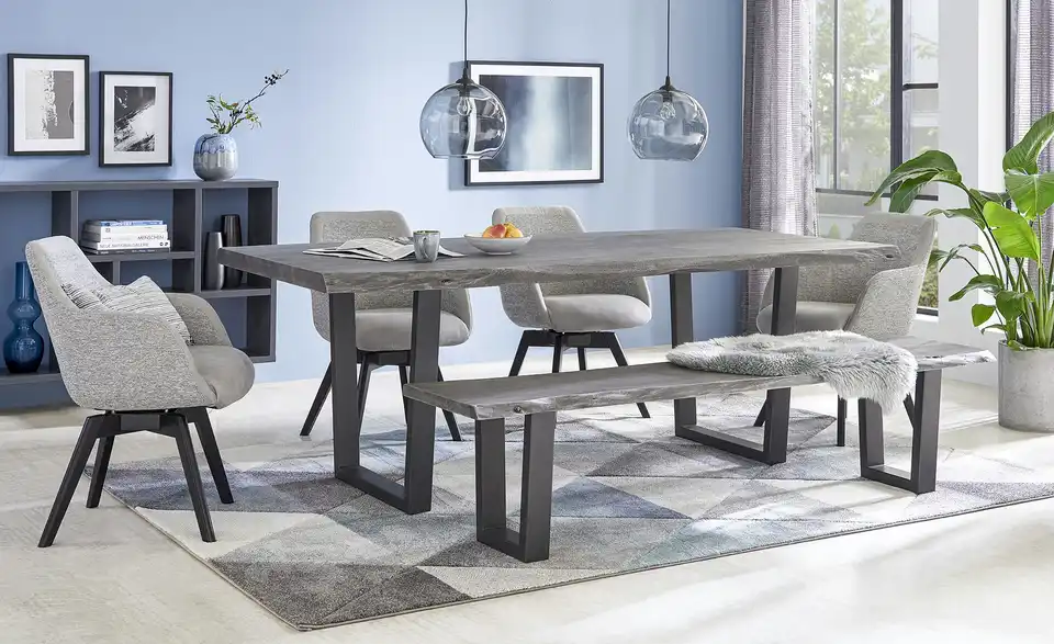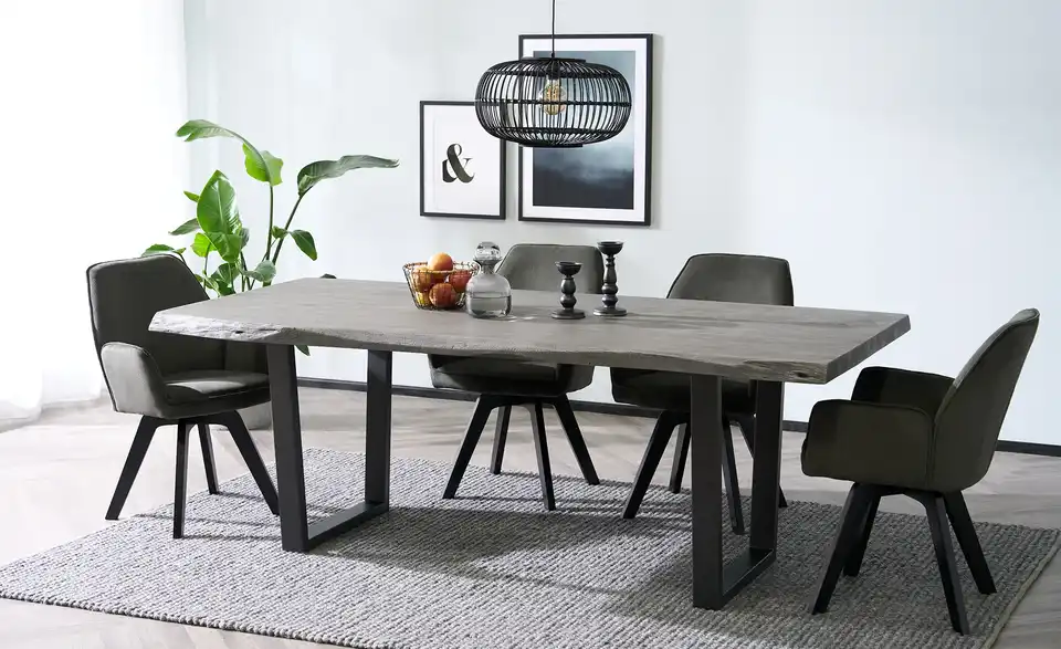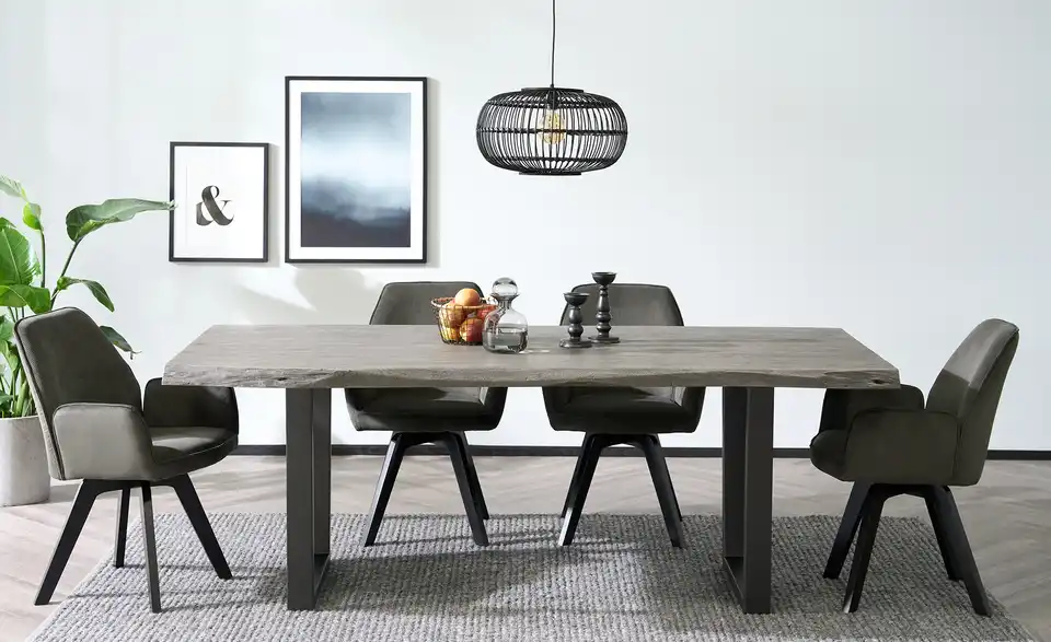 DINE + MINE ist Ihre Marke für markante Speisezimmer-Möbel aus Echtholz und Metall. Mittelpunkt der Esszimmer-Kollektion ist das Tischsystem SigNature aus Akazienholz, bei dem jeder Tisch ein Unikat ist. Die rustikalen Tischplatten verfügen nicht nur über eine einzigartige Maserung, sondern fallen auch durch ihre Längskante in außergewöhnlichen...