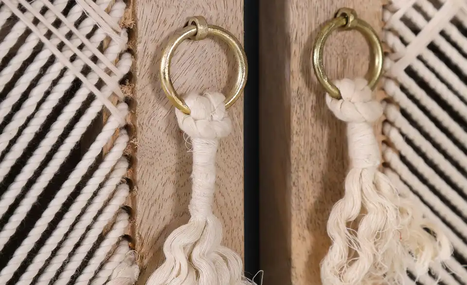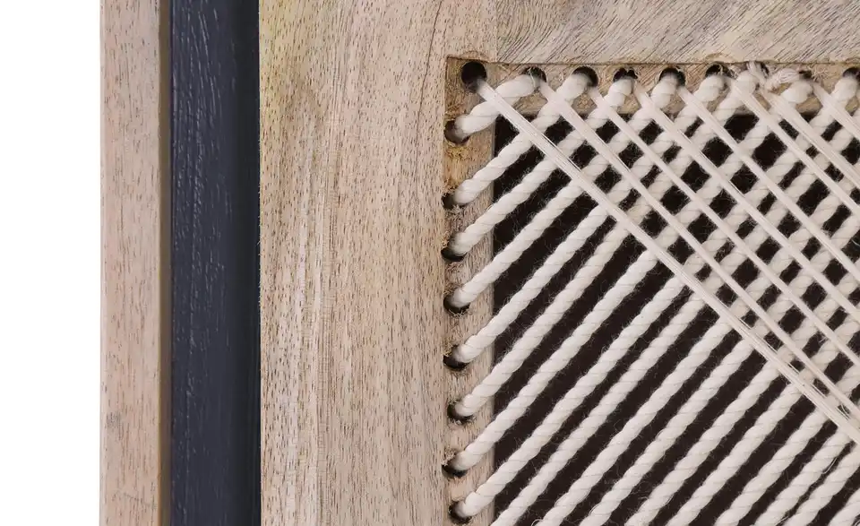 - Mehr zu MaterialMaterial Schnurgeflecht Baumwolle (100%)Massivholz zum Schutz gebeizt und lackiertGriffe Metallringe mit SchnurpendelRückwand Holzwerkstoff (MDF)