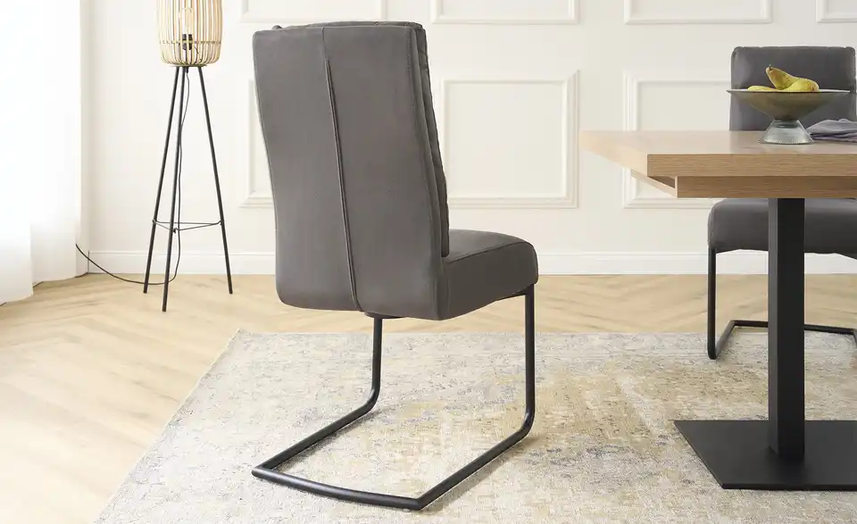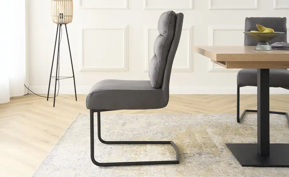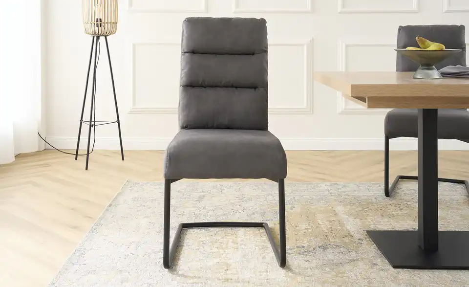 Eine dekorative und entspannte Bereicherung für das behaglich ausgestattete Zuhause stellt dieser charmante Freischwinger dar. Der Stuhl begeistert mit seinem ansprechenden Bezug aus Mikrofaser. Ein Gestell aus schwarzem Metall ist das Fundament der Sitzmöglichkeit. Der Stuhl nimmt 43 x 99 x 62 cm ein. Wo auch immer Sie dieses Möbel aufstellen, wird Ihr zukünftiger Lieblingsplatz sein.Lieferung & Versand