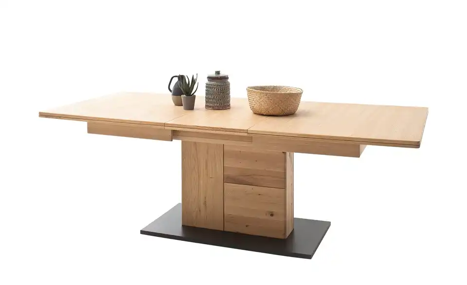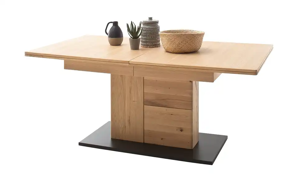 - Mehr zu MaterialTischplatte aus Holzwerkstoff furniert in Eiche Bianco geöltTischsäule aus Massivholz in Balkeneiche Bianco geöltBodenplatte aus Holzwerkstoff lackiert in Anthrazit