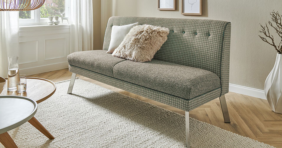 - AusführungSitzfläche in meliertem, grobem Webstoff / Rücken und Korpus in Webstoff mit Hahnentritt-Muster