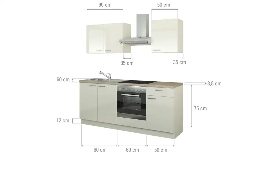 - Bestehend ausSpülenunterschrank (BHT) 90 x 75 x 57 cm, 2 TürenHerdumbau (BHT) 60 x 75 x 57 cm, Herdnische 57 cmHerd (BHT) 59,5 x 59,5 x 53,8 cmGlaskeramik-Kochfeld (BHT) 58 x 4,2 x 51 cmUnterschrank (BHT) 50 x 75 x 57 cm, 1 Tür, 1 Einlegeboden, 1 SchubkastenWandschrank (BHT) 90 x 60 x 35 cm, 2 Türen, 1 EinlegebodenDunstabzugshaube (BHT) 59,5 x 14 - 96 x 50 cmWandschrank (BHT) 50 x 60 x 35 cm, 1 Tür, 1 EinlegebodenArbeitsplatte (BHT) 200 x 3,8 x 60 cm