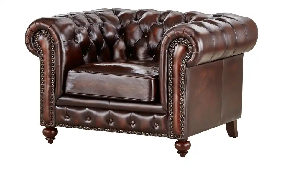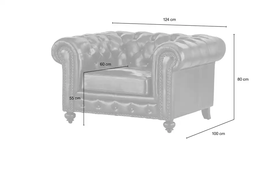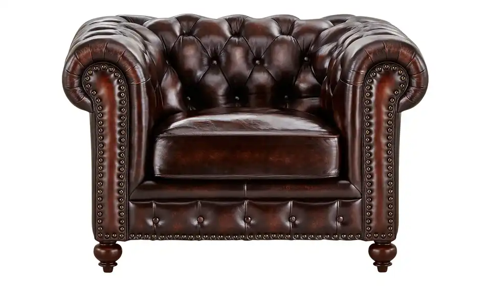Mit dem Sessel Chesterfield ziehen ansprechender Komfort und Behaglichkeit bei Ihnen ein. Ihr persönliches Einrichtungskonzept wird dank des Retro-Stils vervollständigt. Bei diesem Sessel können Sie auf die hervorragende Qualität der Marke Primo bauen. Leder bildet die Materialgrundlage für den Bezug der Sitz- und Rückenfläche. Das Modell Chesterfield verfügt über eine Nosagfederung sowie eine komfortable Polsterung aus Schaumstoff für das maximale Wohlfühlerlebnis und nimmt insgesamt 124 x 80 x 100 cm ein. Auf diesem Sessel können Sie sich stets ideal erholen und entspannen.Lieferung & Versand