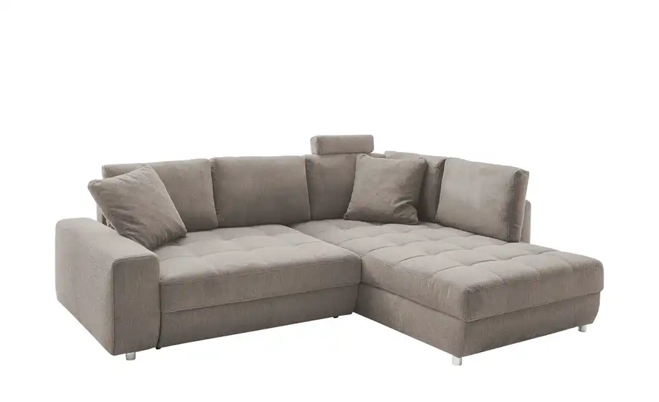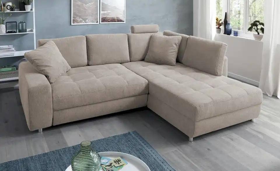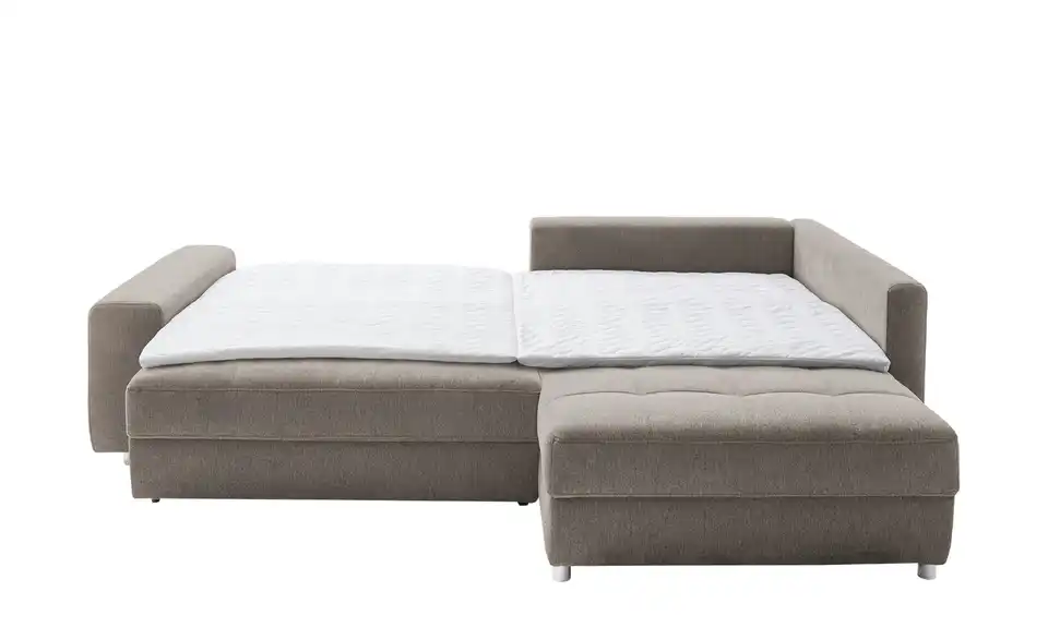 Für Ihr Interieur ist dieses Ecksofa die perfekte Bereicherung. Dank des echt bezogenen Rückens kann die Marken-Couch von bobb frei im Raum aufgestellt werden. Für das maximale Wohlfühlerlebnis verfügt sie über eine Boxspringfederung sowie eine komfortable Polsterung aus Schaumstoff. Das Gestell aus Kunststoff ist die Basis des Sofas. Hübsche Zierkissen, ein Topper sowie Rückenkissen sind im Lieferumfang inbegriffen und müssen nicht extra mitbestellt werden. Das Sofa stellt einen integrierten Bettkasten zur Verfügung und nimmt 265 x 84 x 209 cm ein. Außerdem weist es eine Belastbarkeit von 570 kg auf und wird durch die geräumige Sitztiefe von 81 cm zu einem Ruheort. Auf dieser ansprechenden und gleichzeitig praktischen Couch können Sie es sich nach einem langen Tag gemütlich machen.Lieferung & Versand