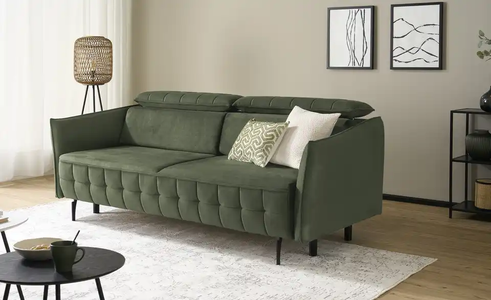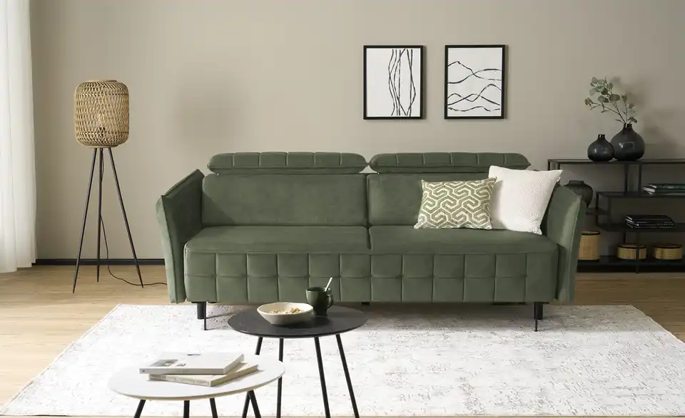 Besonders bequem sitzen und ausruhen lässt es sich auf dem Bigsofa Momoka. Die Couch schenkt Ihnen nicht nur hervorragenden Komfort, sondern ist dank ihres Retro-Stils auch ein wahres Design-Statement. Das Marken-Sofa von smart ist frei im Raum platzierbar. Als Material für das Gestell wird Metall verwendet. Das Modell Momoka lässt sich dank der praktischen Bettfunktion zu einem behaglichen Schlafsofa umbauen und nimmt 226 x 90 x 104 cm ein. Dieses Sofa wird ganz schnell zum zuverlässigen Entspannungsort, der Ihren vier Wänden optisch wie funktionell den letzten Schliff verleiht.Lieferung & Versand