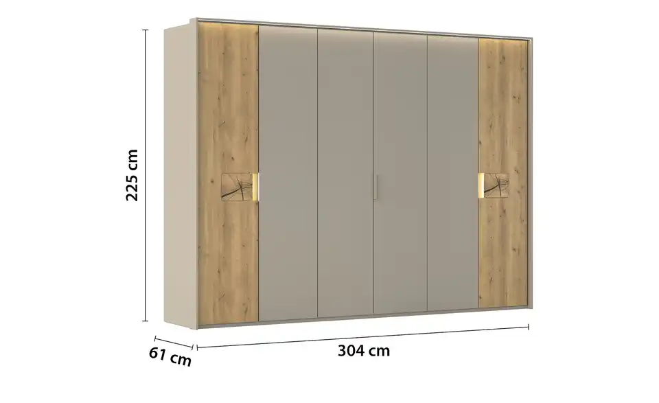 - Mehr zu AusführungInkl. LED-Beleuchtung der Griffmulden in den Außentüren und Passepartoutrahmen mit LED-Beleuchtung