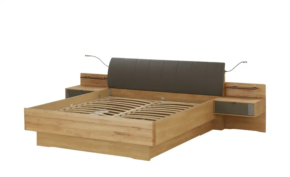 - Mehr zu AusführungBettanlage (Liegefläche ca. 200x200 cm) inklusive Nachtschrank Paar mit Nachtschrankpaneel Paar mit Rauchglasboden und Beleuchtung, Bettschubkasten Paar, LED-Flexleuchten-Paar und LED-Ambientebeleuchtung für das Kopfteil