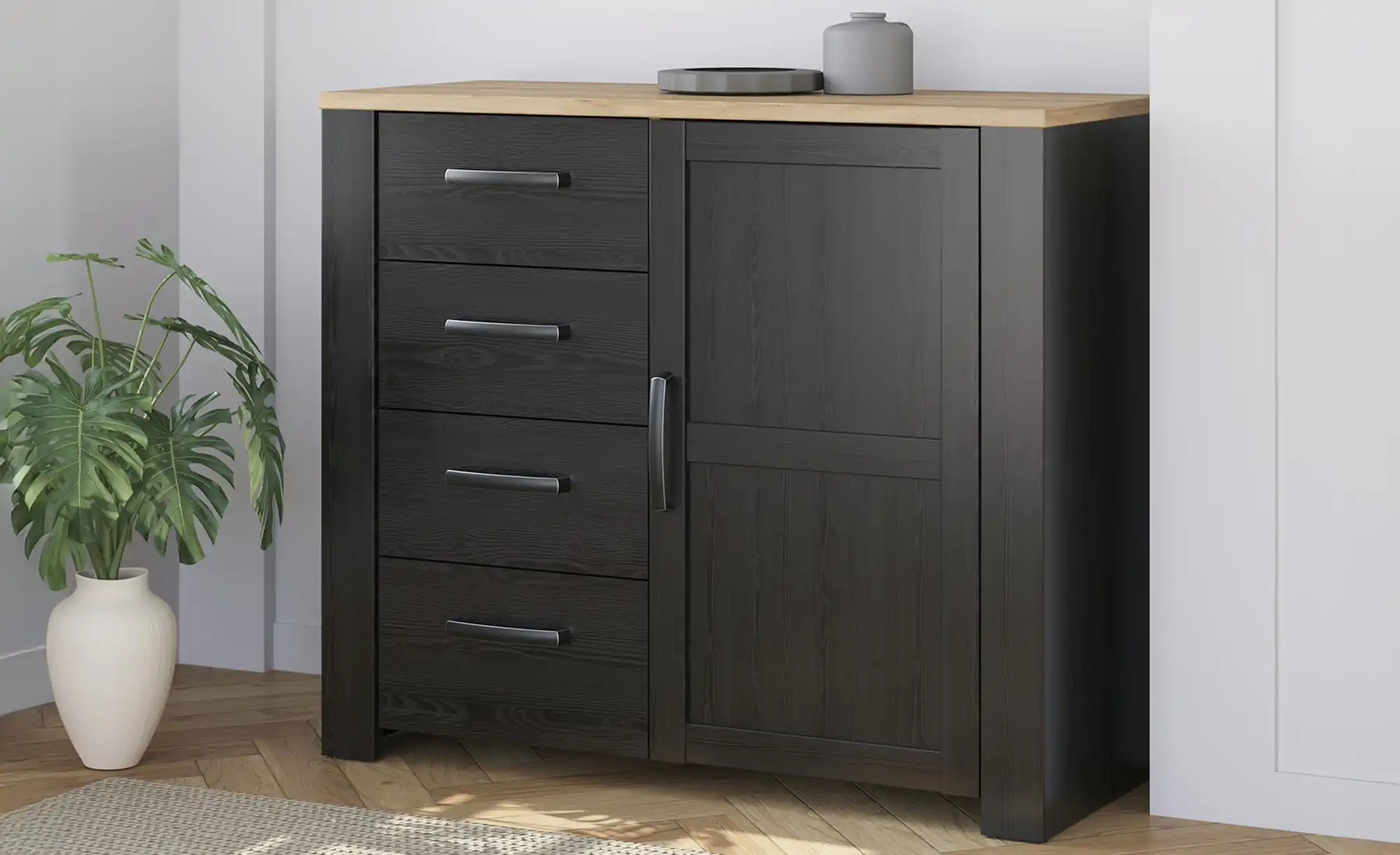 - Mehr zu FarbeFront und Korpus Mooreiche (Nachbildung)Applikation Riviera Eiche (Nachbildung)