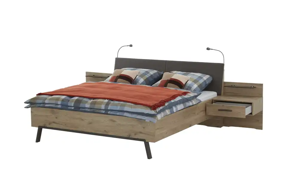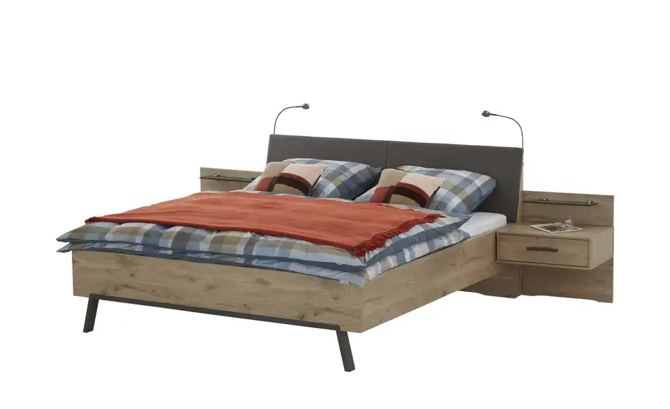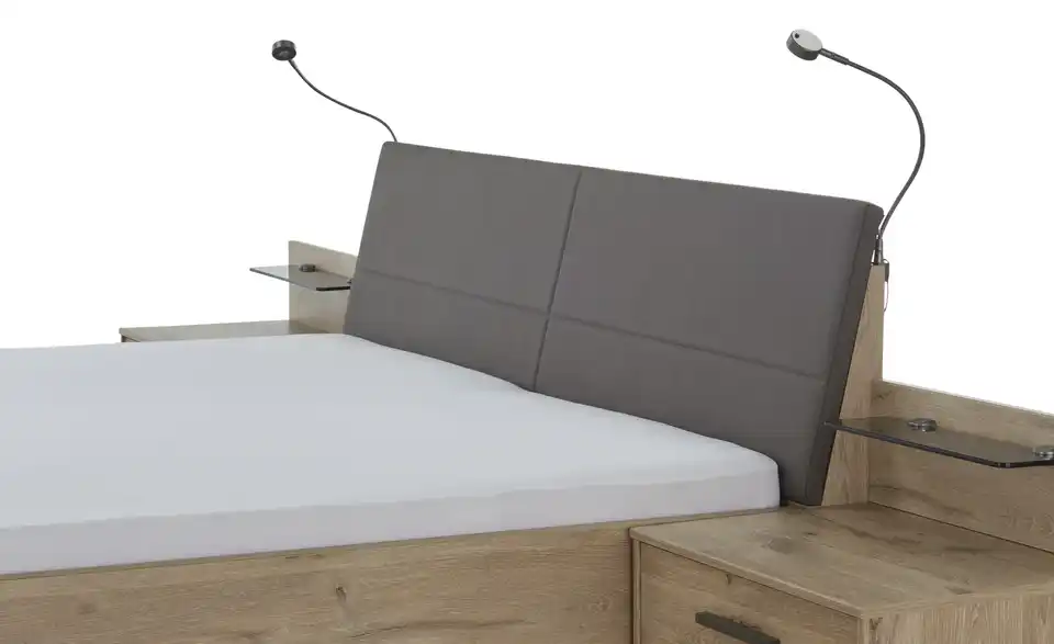 - Lieferumfang / mitgeliefertes ZubehörBettgestell mit PolsterkopfteilNachtkonsolen (Paar)Nachtkonsolen-Paneele (Paar)LED-Ambientbeleuchtung KopfteilLED-Flex-Leuchten (Paar)