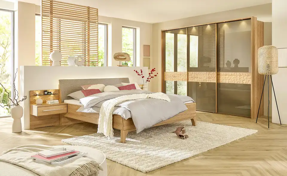 - Lieferumfang / mitgeliefertes ZubehörBettgestell mit PolsterkopfteilNachtkonsolen mit je 1 Auszug (Paar)Nachtkonsolenpaneele (Paar)LED-Ambient-Beleuchtung (Kopfteil)