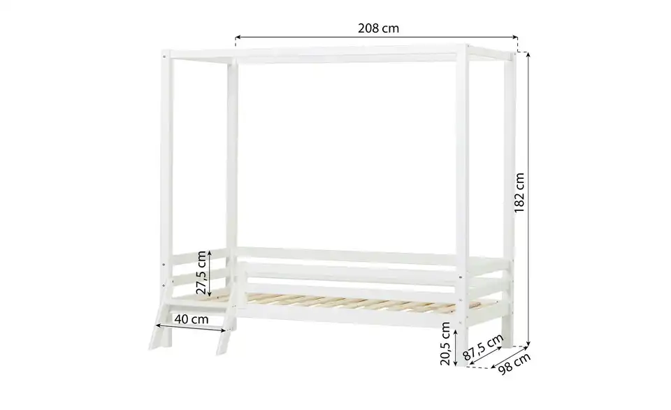 - Lieferumfang / mitgeliefertes ZubehörHimmelbett, bestehend aus Einzelbett / Kinderbett und Himmelbett-Modul, mit zusätzlichem Rausfallschutz und kleiner Leiter, 90x200 cm, Weiß