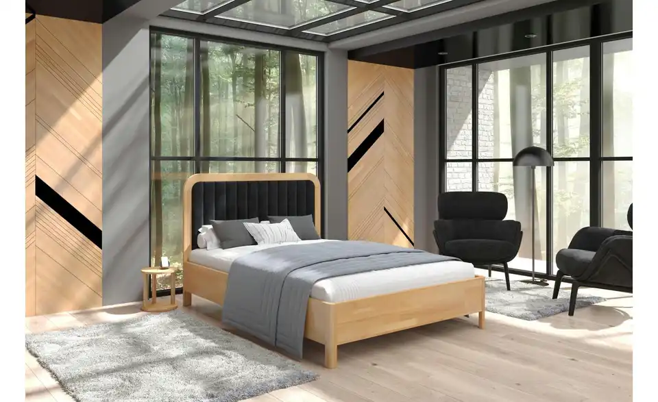 - Lieferumfang / mitgeliefertes ZubehörMassivholzbettgestell mit gepolstertem Kopfteil