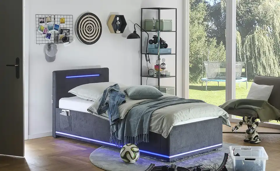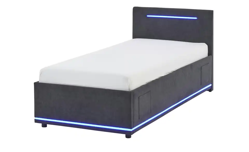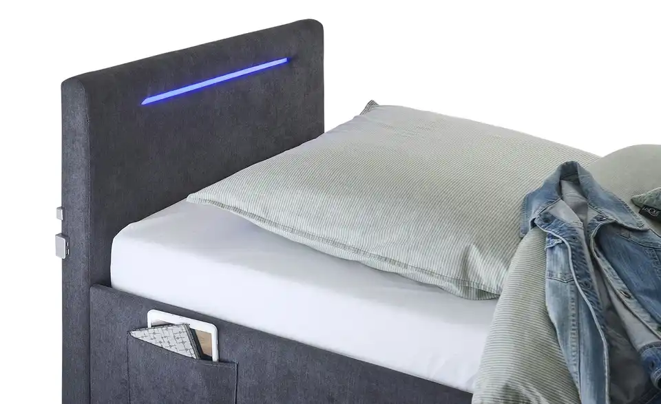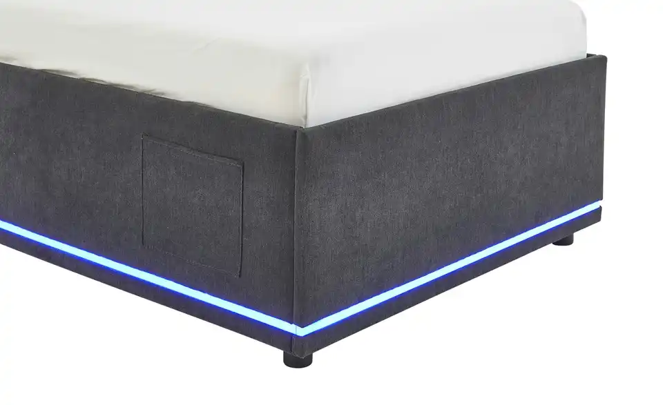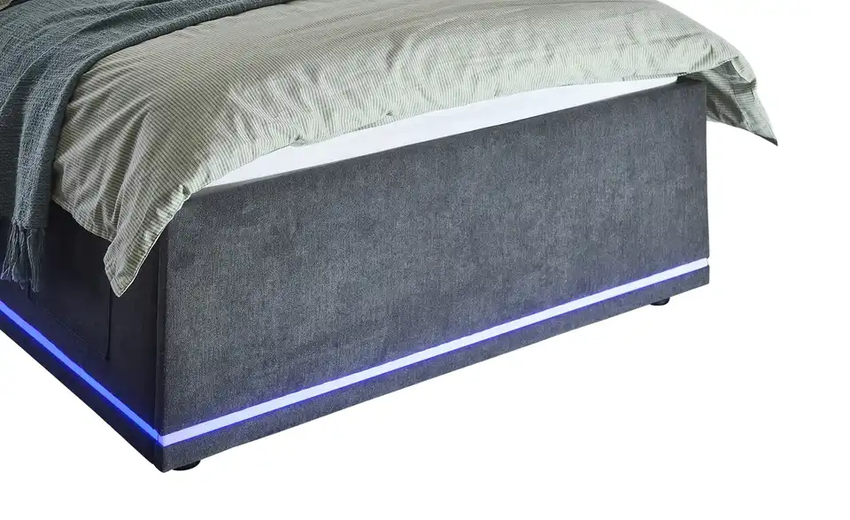 - Modernes Polsterbett mit LED-Beleuchtung in Blau