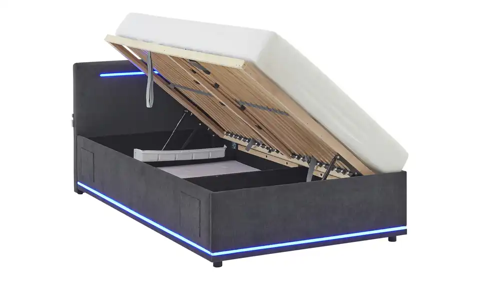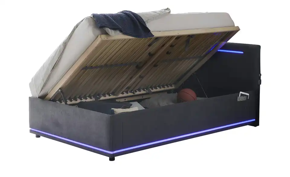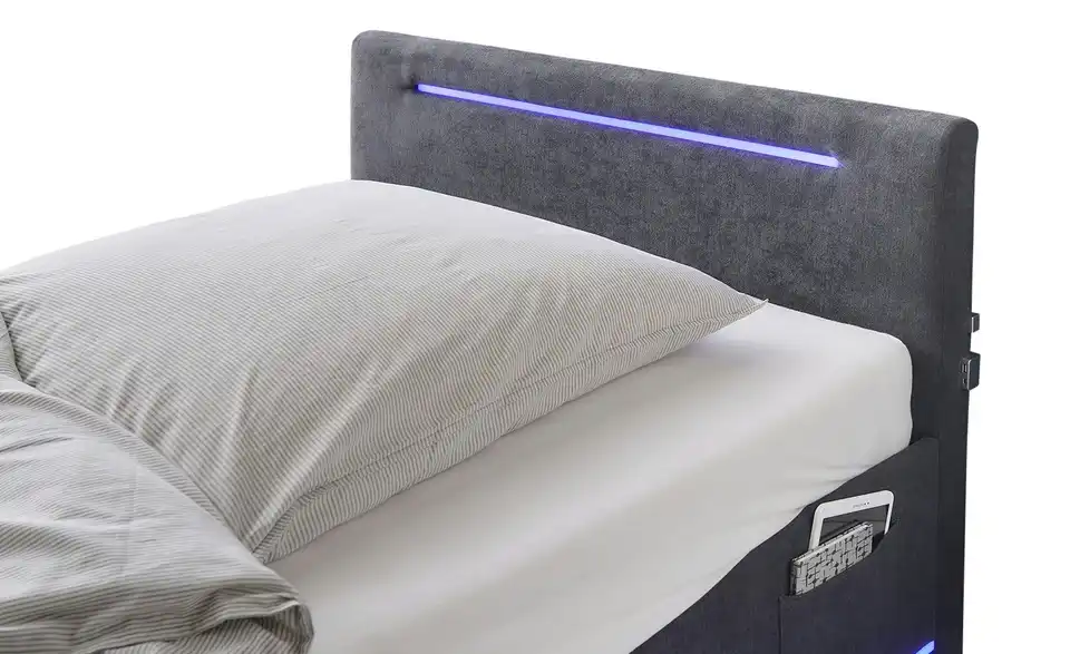 - Modernes Polsterbett mit LED-Beleuchtung in Blau