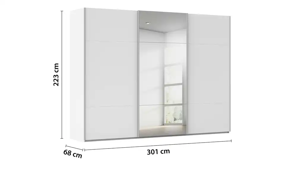 - Mehr zu AusführungDreitüriger Schwebetürenschrank mit Spiegel inkl. ZubehörBestehend aus drei Elementen (je ca. 100 cm breit)