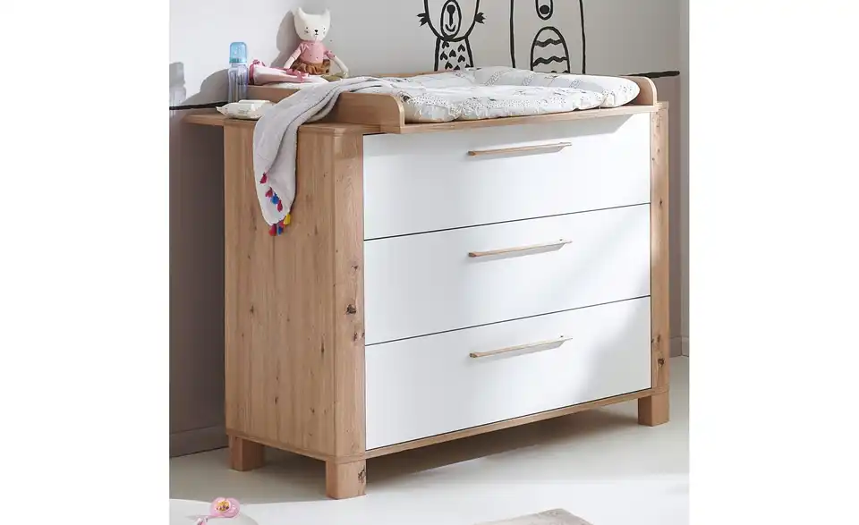 - Lieferumfang / mitgeliefertes ZubehörWickelkommode inkl. Wickelaufsatz (B/H/T) 115/100/79 cm, Babybett inkl. Lattenrost (143/87/77 cm)