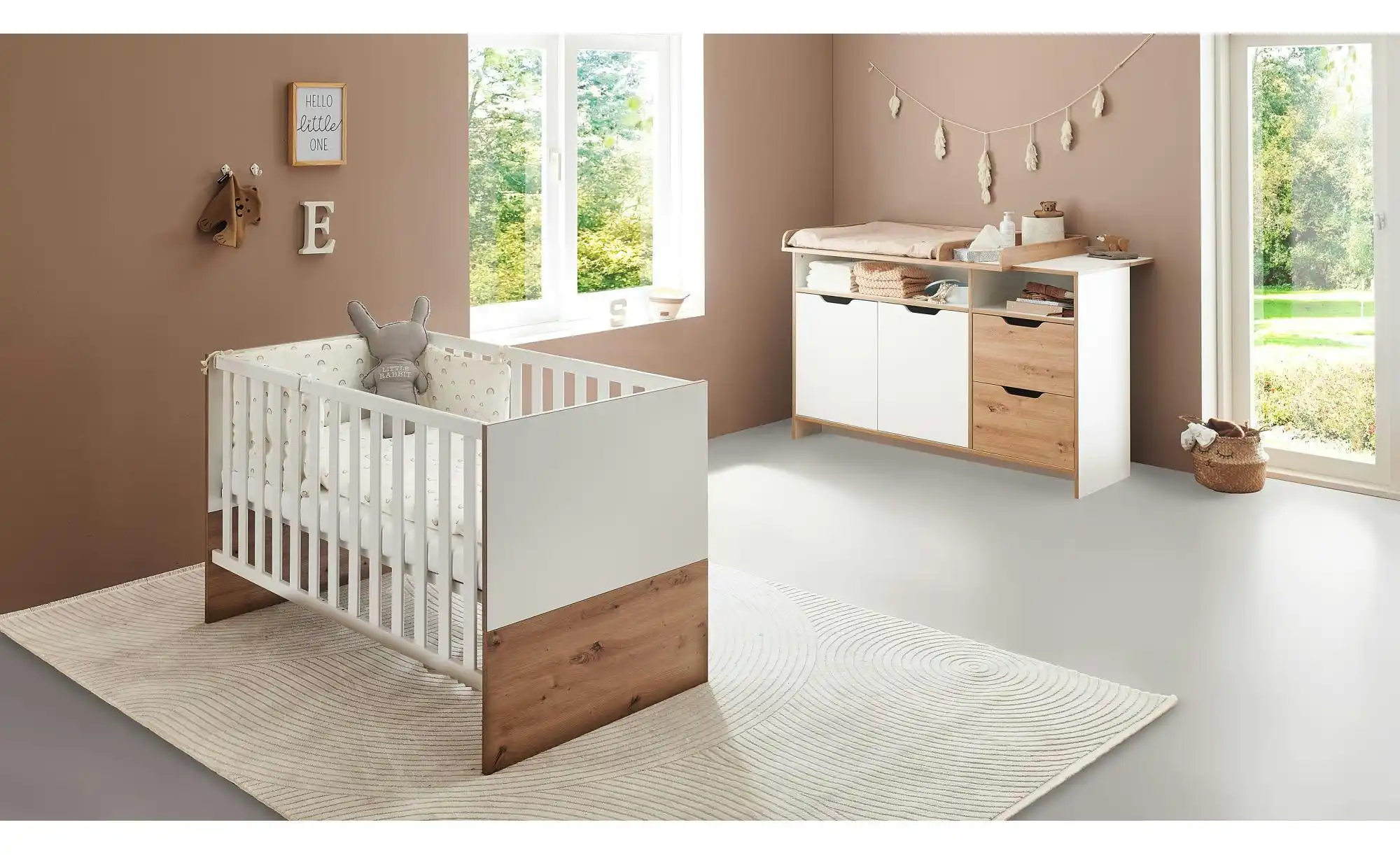 - Lieferumfang / mitgeliefertes ZubehörWickelkommode inkl. Wickelaufsatz (B/H/T) 150/101/79 cm, Babybett inkl. Lattenrost (143/84/76 cm)