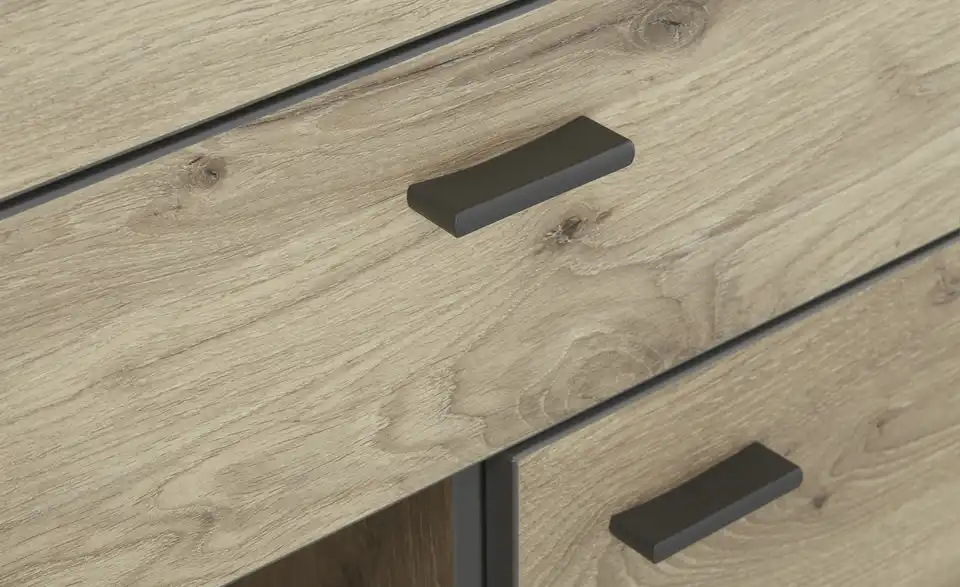- Mehr zu MaterialKorpus und Front aus Holzwerkstoff foliert in Viking Oak (Eiche Nachbildung)Frontverglasung und Glasböden aus KlarglasRahmen und Griffe in Cosmos Grey (Dunkelgrau)