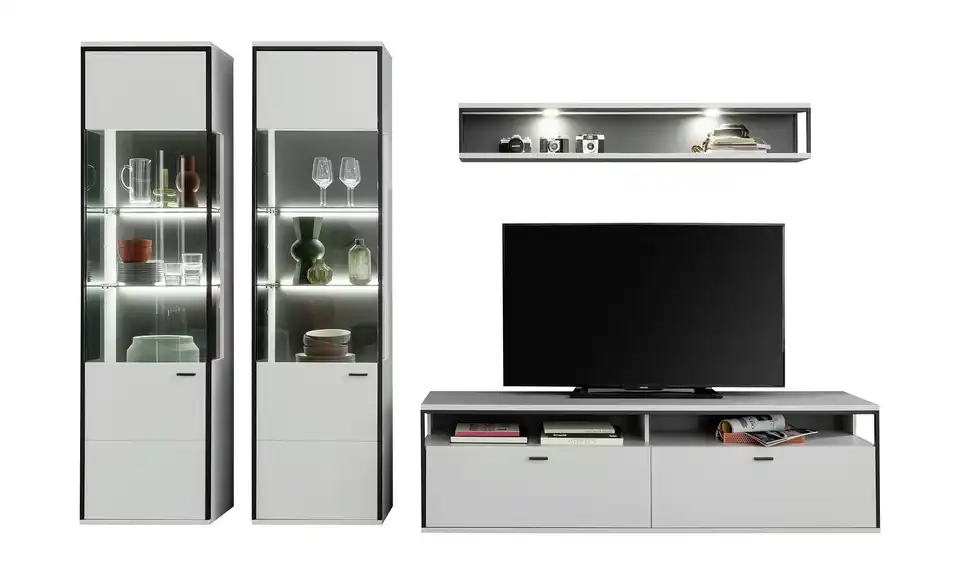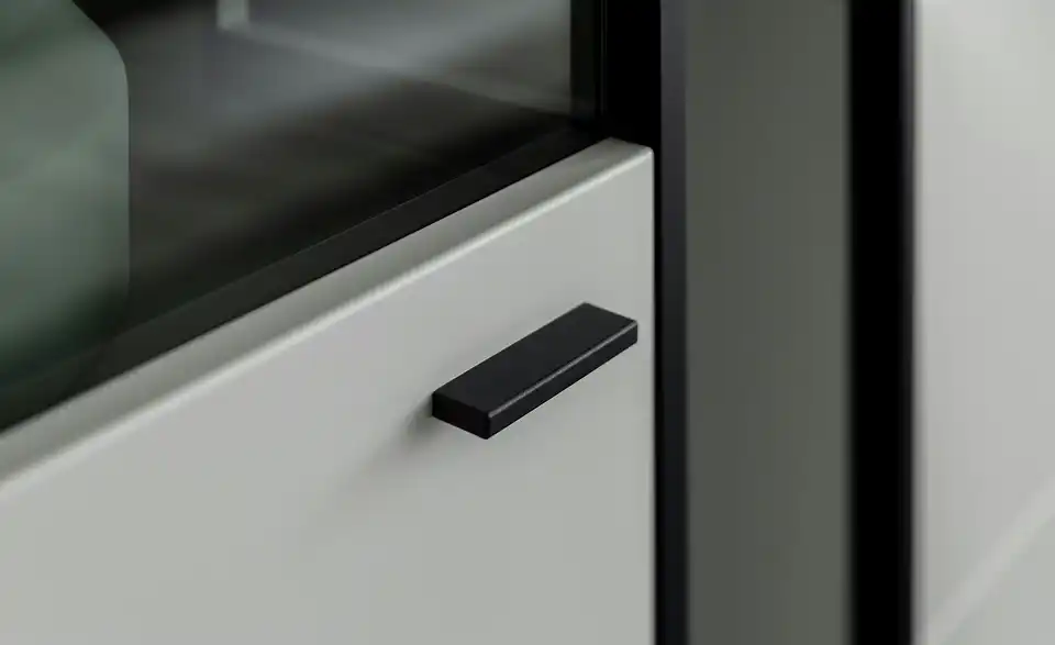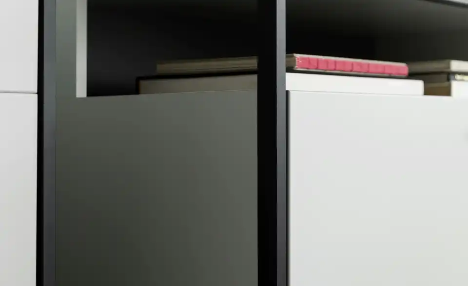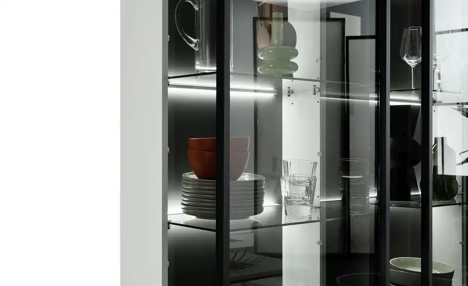 - Mehr zu MaterialKorpus aus Holzwerkstoff melaminbeschichtet in Modern White / innen WeißFront aus Holzwerkstoff tiefgezogen in Modern WhiteKorpusrahmen aus Aluminium in SchwarzgrauFront- und Seitenverglasung aus ESG (Einscheibensicherheitsglas) in Parsol Grau / Glasböden aus Klarglas