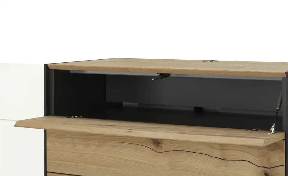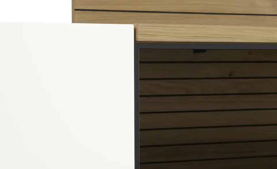 - Mehr zu MaterialKorpus und Front aus Holzwerkstoff lackiert in Polarweiß mattAbsetzungen aus Eiche hell furniertFrontverglasung in Parsol Grau