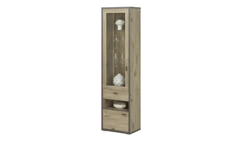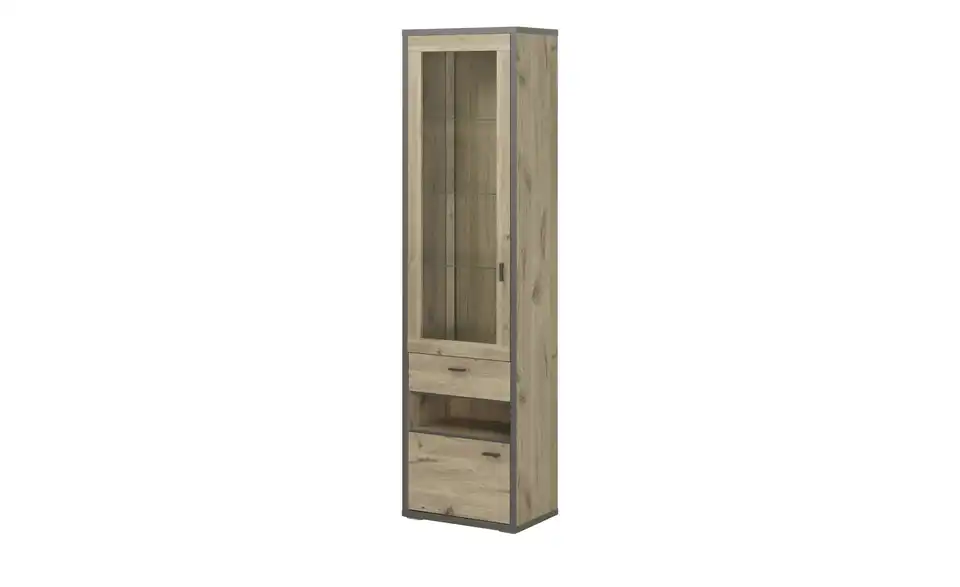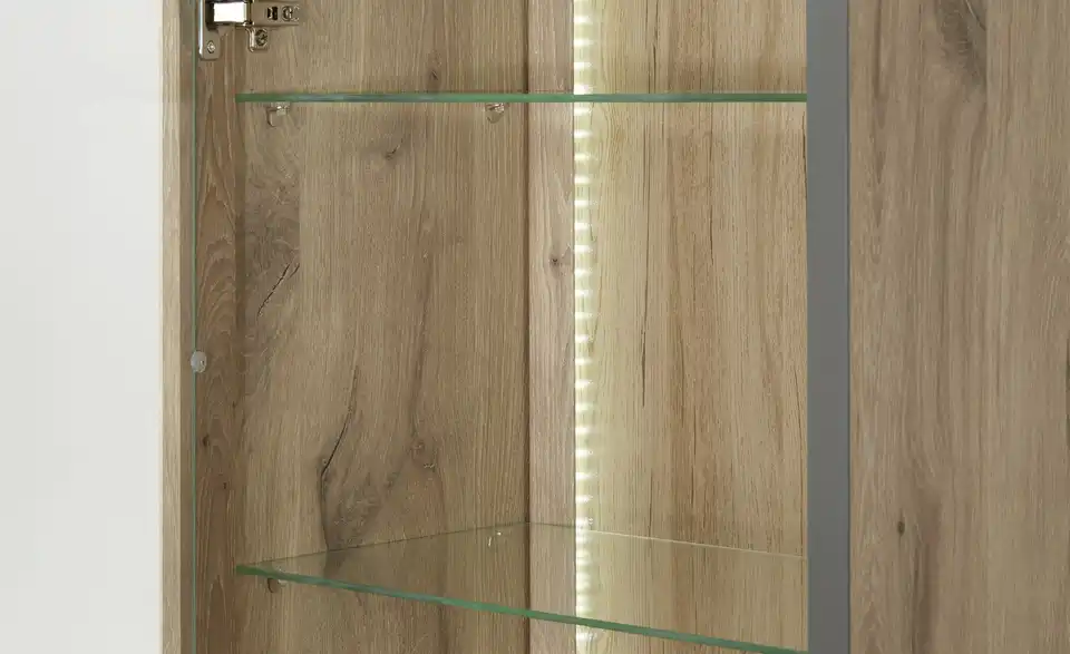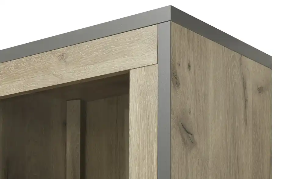 - Mehr zu MaterialKorpus und Front aus Holzwerkstoff foliert in Viking Oak (Eiche Nachbildung)Rahmen und Griffe in Cosmos Grey (Dunkelgrau)Frontverglasung und Glasböden aus Klarglas
