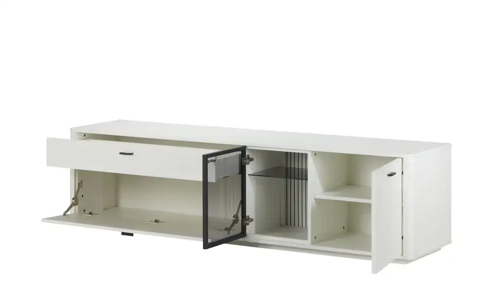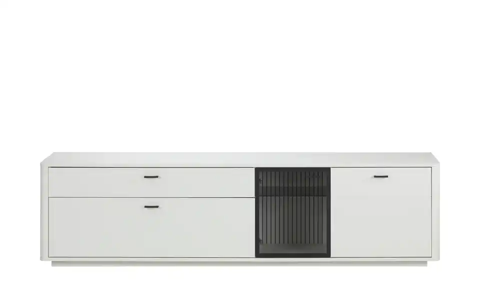 - Mehr zu MaterialKorpus und Front aus Holzwerkstoff lackiert in Weißsichtbare Rückwand in Lamellenoptik Weiß lackiertFrontverglasung in Parsol Grau