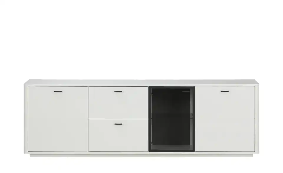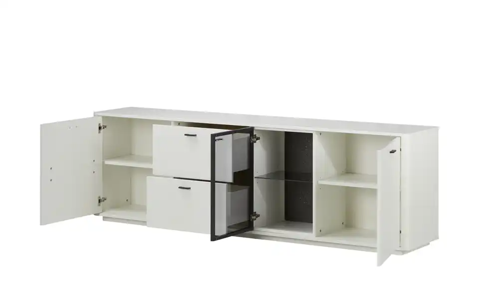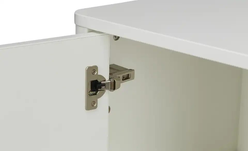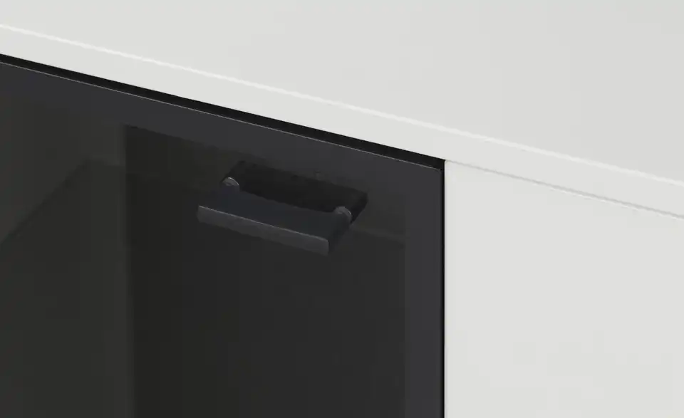 - Mehr zu MaterialKorpus und Front aus Holzwerkstoff lackiert in Weißsichtbare Rückwand aus KristallsteinFrontverglasung in Parsol Grau