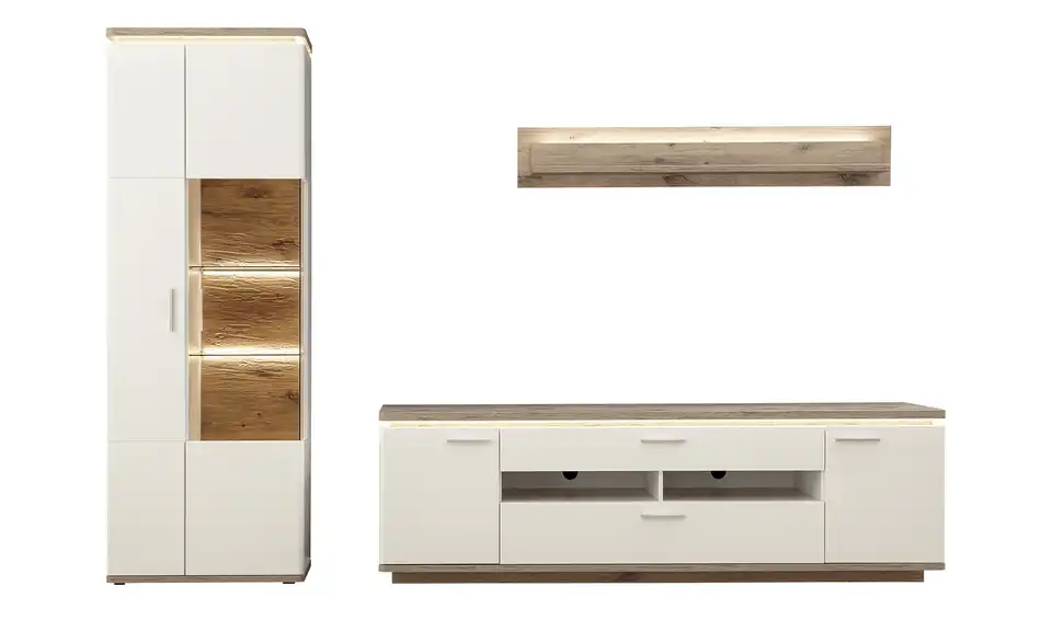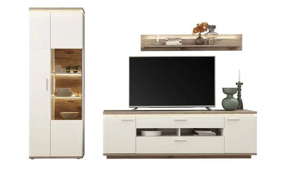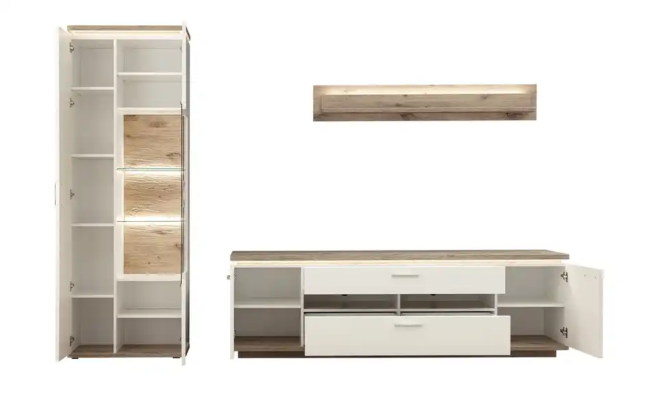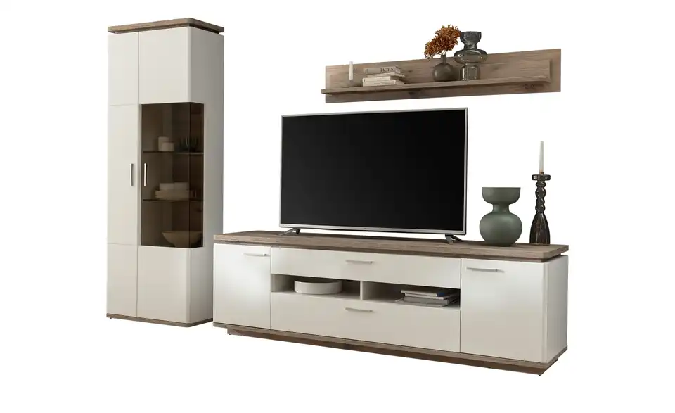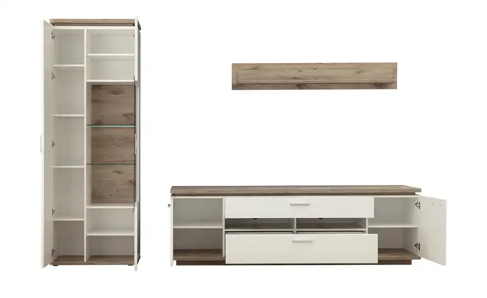 - Mehr zu MaterialFront aus Holzwerkstoff tiefgezogen in Soft White (Weiß)Korpus aus Holzwerkstoff melaminbeschichtet in Soft White (Weiß)Korpusabsetzung aus Holzwerkstoff melaminbeschichtet in Viking Oak (Eiche Nachbildung)Front- und Seitenverglasung in Pasol BraunGriffe aus Metall in Nickel matt