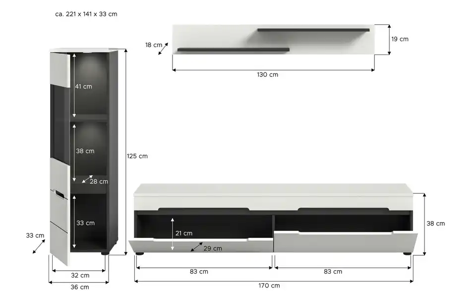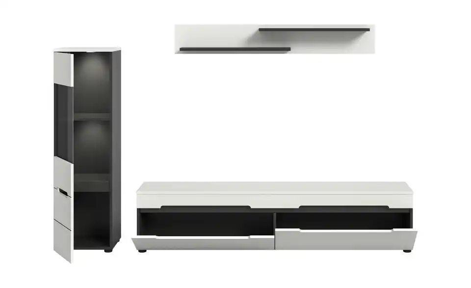 - Lieferumfang / mitgeliefertes Zubehör1x Vitrine, 1x Lowboard+Wandboard, Beleuchtung