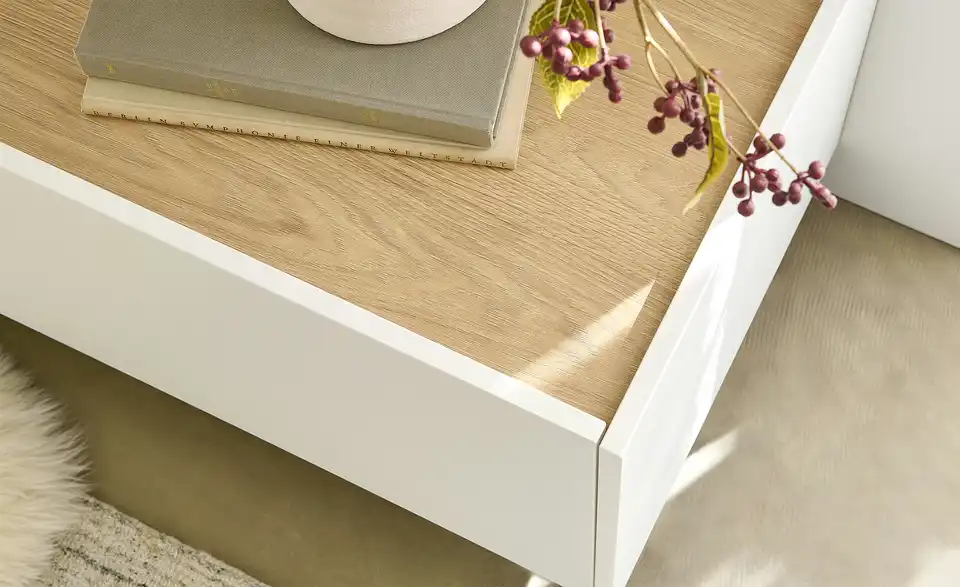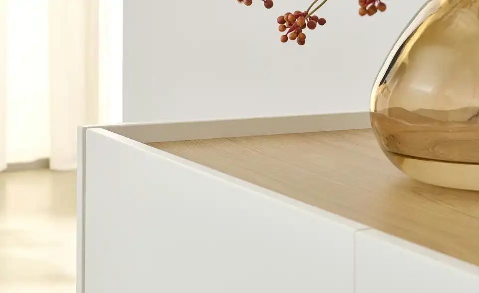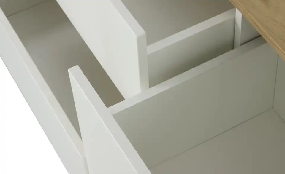 - Mehr zu MaterialKorpus und Front aus Holzwerkstoff melaminbeschichtet in KashmirAbsetzung aus Holzwerkstoff melaminbeschichtet in Eiche Hikora (Nachbildung)