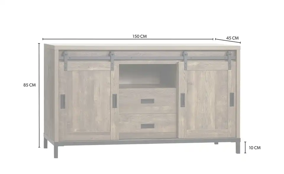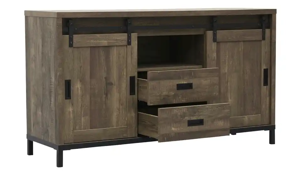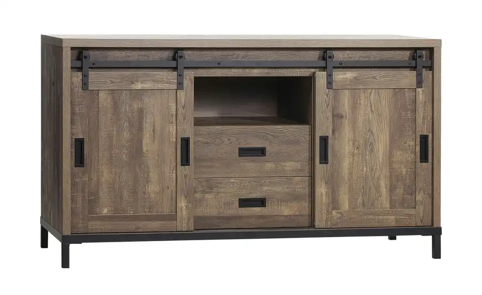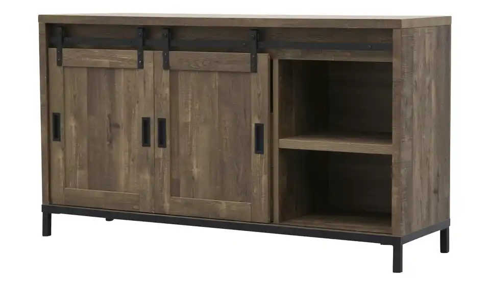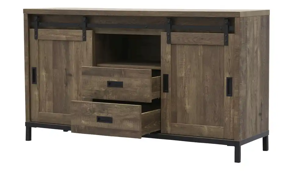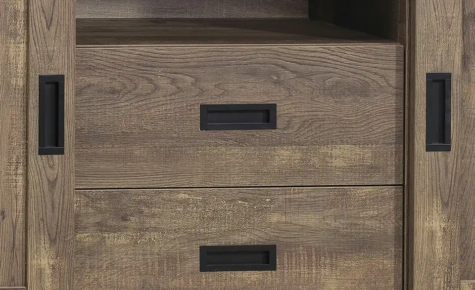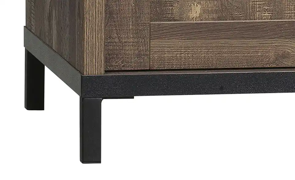 - Mehr zu MaterialKorpus und Front aus Holzwerkstoff beschichtet in Espresso (Nachbildung)Griffe, Gestell und Türschiene aus Metall in Schwarz