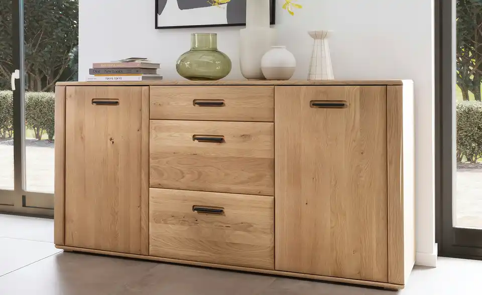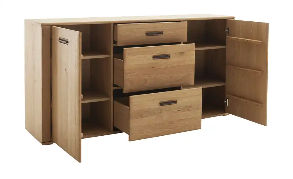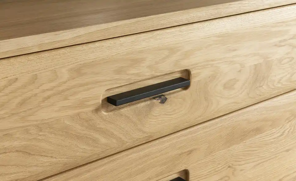 - Mehr zu MaterialFront aus Ast/Balkeneiche massiv mit durchgehender Lamelle in Kristalleiche geöltKorpus aus Ast/Balkeneiche furniert in Kristalleiche geöltGriffe aus Metall in Anthrazit