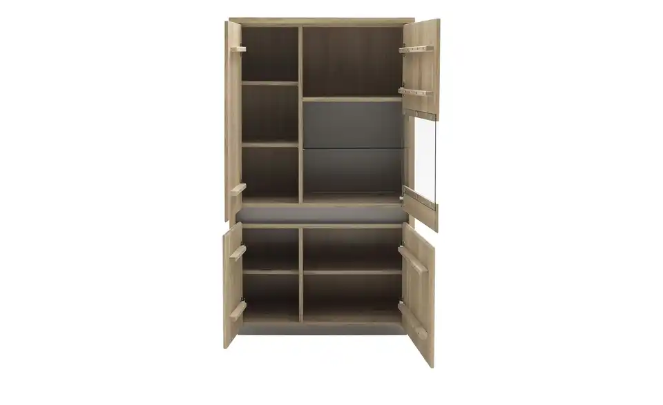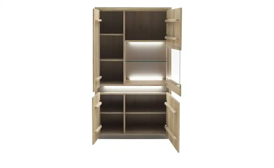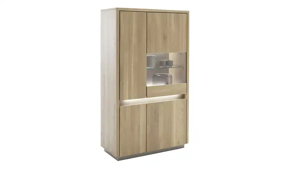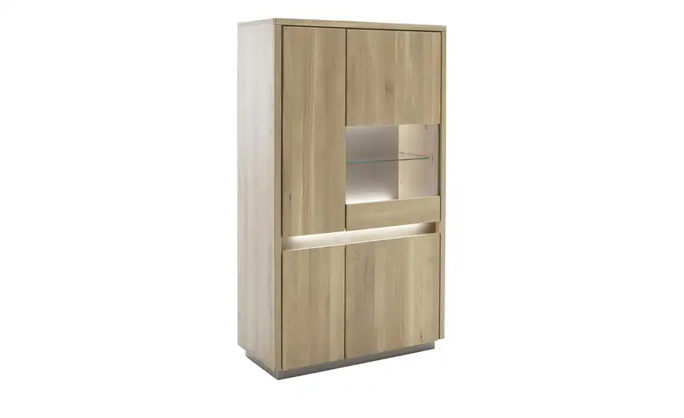 - Mehr zu MaterialFront aus Eiche massiv in Kristalleiche geölt mit durchgehender LamelleKorpus aus Holzwerkstoff foliert in Kristalleiche (Nachbildung)Griffmulde, sichtbare Rückwand und Sockel aus Holzwerkstoff foliert in TaupeFrontverglasung aus Klarglas