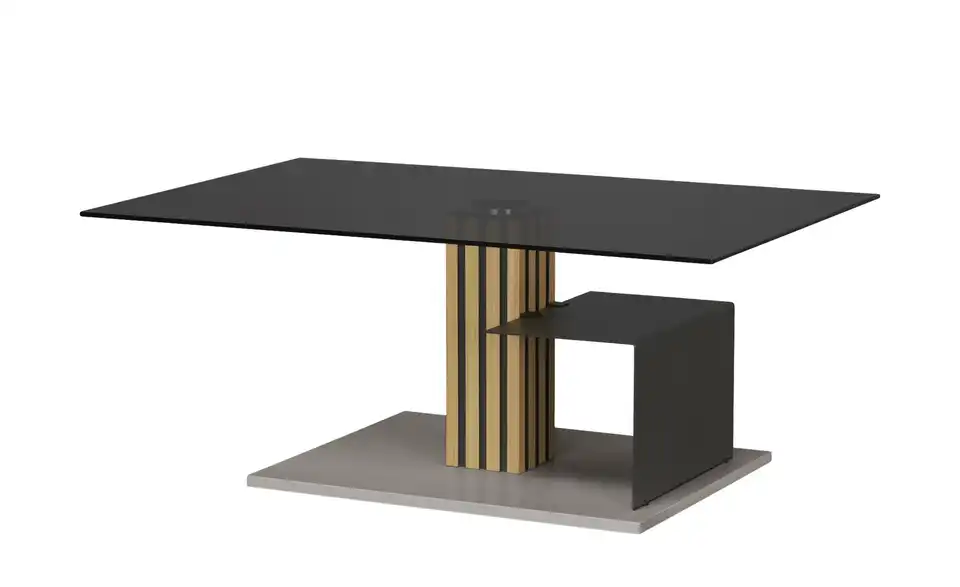 - Mehr zu MaterialTischplatte aus Parsolglas in DunkelgrauSäule aus Holzwerkstoff furniert in Eiche hellAblage aus Metall in DunkelgrauBodenplatte aus Holzwerkstoff lackiert in Nougat matt