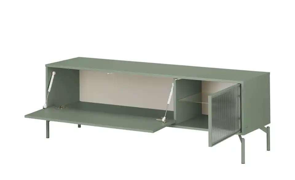Dieses TV-Lowboard verbindet modernes Design mit zeitgemäßen Funktionen und Stauraum. Das grifflose, einfarbige Design passt in nahezu jedes Raumkonzept. Die blickdichte Klappe und die geriffelte Glastür lassen sich durch die Push-to-open-Funktion kinderleicht öffnen. Durch die Riffeloptik der Glastür schimmern die dahinter platzierten Dekoobjekte nur dezent durch. Die mitgelieferte Glaskantenbeleuchtung, die übrigens auch über eine Timer-Funktion verfügt, sorgt hier für ein echtes Wohlfühl-Ambiente. Außerdem praktisch: Sie können die Farbe des Lichts mit der Fernbedienung mühelos ändern.Lieferung & Versand
