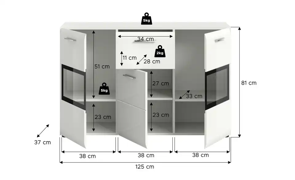 - max. Belastbarkeit je verstellbarem Einlegeboden bis ca.5 kg